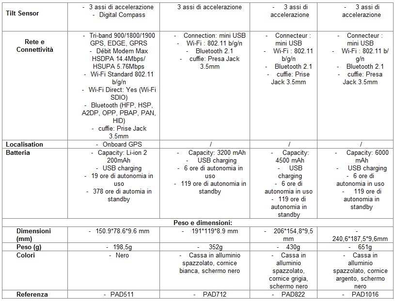 La qualità dei materiali (cassa in metallo), le connessioni integrate e il piccolo spessore lo rendono particolarmente elegante. Dotato di sistema operativo Android 4.0.3 (Ice Cream Sandwich), un mondo di applicazioni saranno a vostra disposizione. Potrete accedere facilmente a tutti i contenuti grazie al processore dual core da 1,5 GHz, inoltre, grazie al Wifi e al Bluetooth connettere tra loro tutti i vostri dispositivi elettronici sarà semplicissimo. Dotati di fotocamera da 2 megapixel, il 7” ha una batteria da 3200 mAh, mentre l’8” ne monta una da 4400 mAh.