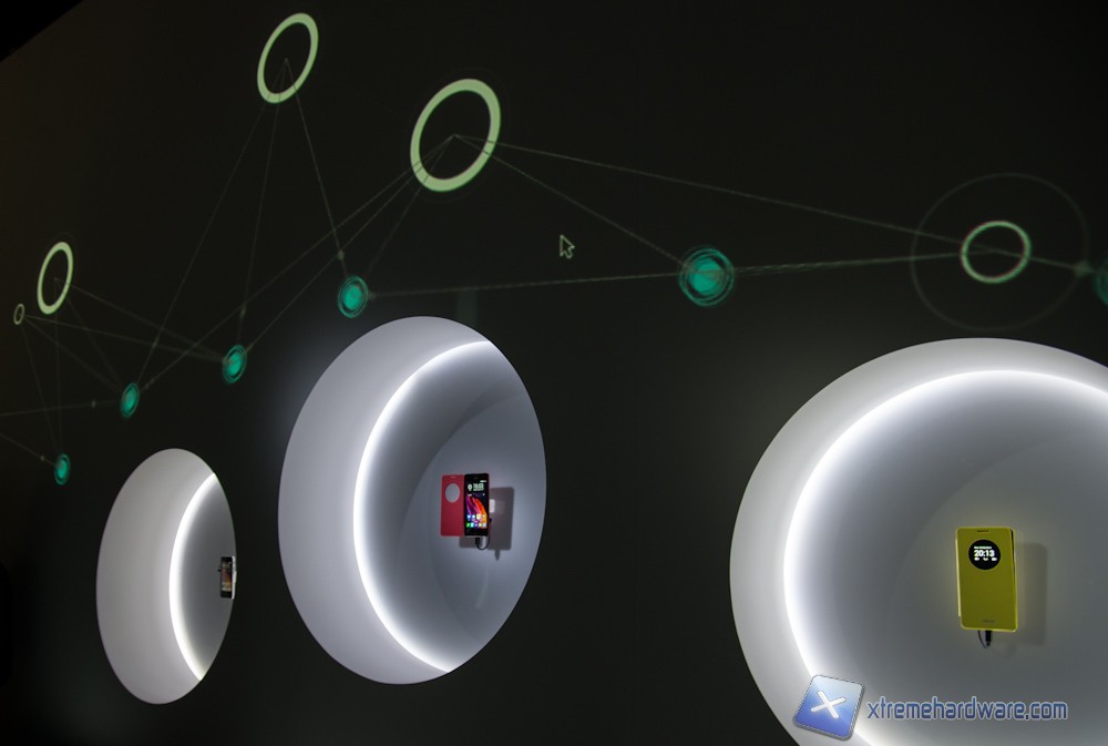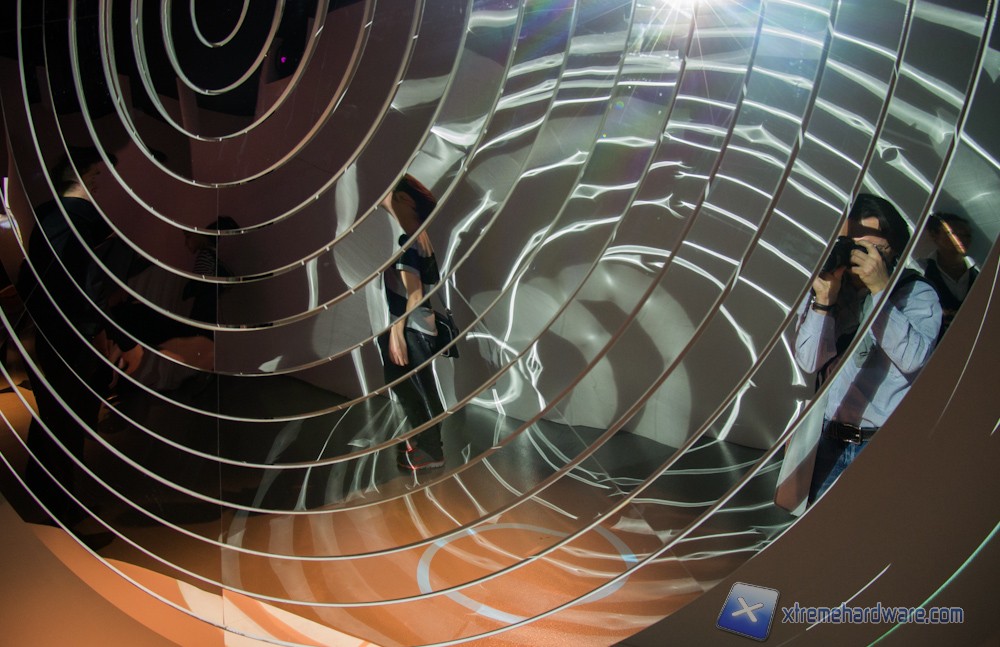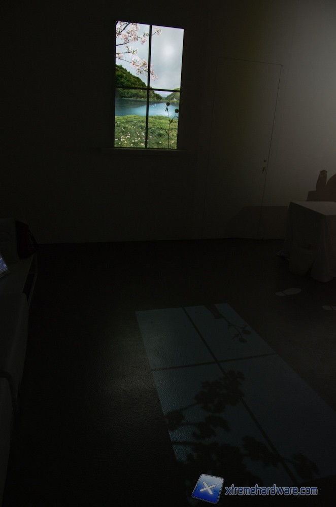 Tra i vari modelli di dispositivi mobile, troviamo un altro spazio dedicato a due installazioni molto particolari, tanto per sottolineare il connubio tra tecnologia e arte. Un’affascinante finestra “digitale” ci proietta su un paradisiaco giardino dove impazza la primavera, tra petali di fiori di pesco, farfalle e alternanza di temporali e schiarite. Il fascino di questa finestra è dovuto più che altro alla sottostante proiezione, che con un abile gioco di luci ed ombre (le gocce della pioggia, la farfalla e i petali sono abilmente riprodotti nelle ombre) riescono nell’intento di sbalordire il visitatore, avvalorando il motto di ASUS “in search of incredible”.
