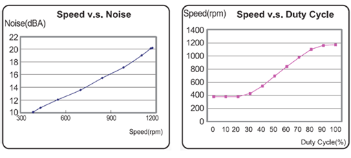 La ventola prodotta da Zaward ha una portata massima di 74.14 CFM, abbinata ad un regime di rotazione molto contentuo, infatti il range operativo 300±250rpm ~ 1200±250 rpm garantisce un livello di rumore davvero minimo. Il Valore dichiarato dal costruttore è di ben 10.1 ~ 20.3 dBA, che come si può intuire garantisce un funzionamento davvero silenzioso. Potete osservare la curva dell'emissione sonora vs Velocità e la curva Velocità vs Duty Cycle.