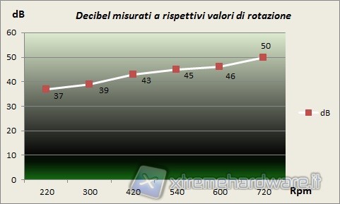 Per i test ci siamo muniti del fonometro LAFAYETTE modello DMB-6 per la misurazione del rumore, mentre per la rilevazione e variazione dei giri, ci siamo avvalsi del Rheobus Zalman modello ZM-MFC3. Nel paragrafo successivo riporteremo il grafico dei risultati.