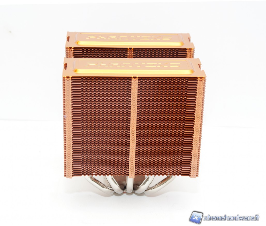 Le 44 alette di ciascun corpo dissipante sono in alluminio e sono realizzate saldando due metà tra loro, in corrispondenza delle heatpipe. Particolarità del Phanteks è una verniciatura colorata delle alette, nel nostro caso di color arancio. Le altre versioni utilizzano una verniciatura rossa, blu o argento in abbinamento a ventole del medesimo colore. La verniciatura non è soltanto a fini estetici. Anche qui Phanteks adotta una tecnologia brevettata che si chiama Physical Antioxidant Thermal Shield. La vernice ha il compito di migliorare le doti di dissipazione e di riflettere le radiazioni infrarosse (calore) da sorgenti esterne in prossimità del dissipatore, come ad esempio la GPU, il Northbridge o le RAM. Questa tecnologia sarà particolarmente utile all’interno dei case.