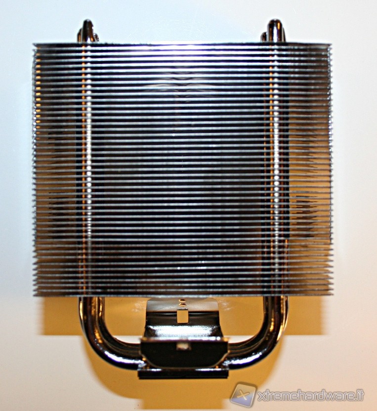 La struttura è molto particolare, seppure comunque sia della tipologia a torre, ben comune ed ormai divenuta quasi uno standard nel mercato dei dissipatori per CPU. La parte frontale ed interna alle alette è standard mentre quella laterale e posteriore presenta delle peculiarità: il design utilizzato permetterà la creazione di un flusso d’aria ottimale, che porterà ad una maggiore efficienza nella dispersione termica del calore, dovuta alla mancanza di zone morte prive di aerazione. Precisiamo inoltre che su ogni aletta ci sono dei piccoli disegni con motivi a freccia e la parte laterale delle alette è chiusa; in tal modo si formerà un unico canale d’aria rivolto verso la porzione posteriore del dissipatore, e del case. La spaziatura tra le alette è di 0,5mm solo che, data la ventola utilizzata e data la profondità del dissipatore, questo ci porterà a pensare che sarà necessario avere una velocità di rotazione elevata, al fine di mantenere un’efficienza elevata. Lo scopriremo presto.