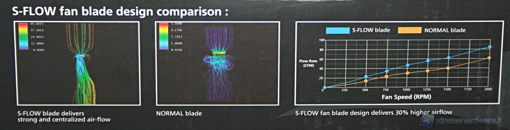- Struttura a torre ottimizzata: in fase di progettazione si è scelto di modificare la parte centrale del dissipatore stesso, in quanto la presenza di rientranze ondulate permettere di ammorbidire il profilo acustico delle ventole e di ottenere un migliore flusso dell’aria nella zona centrale del radiatore. Quest’ultima viene investita trasversalmente dall’ottima "Akasa Viper PWM" “S-Flow” da 12cm, caratterizzata da un quantitativo elevato di pale (ben 9) ed un rapporto tra CFM/dB ottimizzato in funzione di un elevato carico sulla CPU. Inoltre è da menzionare il fatto che ogni pala presenta una struttura tridimensionale tale da permettere un miglioramento del 30% del CFM a parità di rotazione, cosa che come vedremo inciderà molto sia sui risultati che sulla rumorosità.