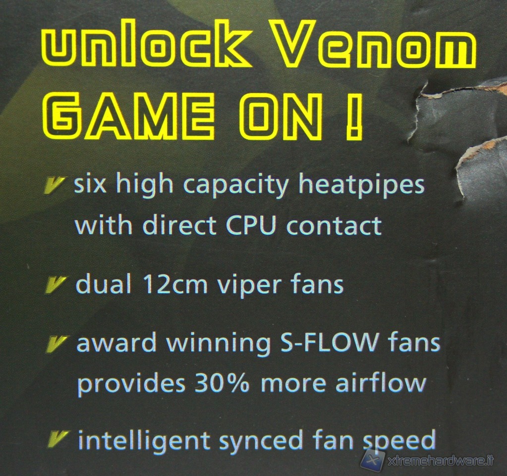 - H.D.T (Heatpipe Direct Touch): la base di contatto presenta le Heatpipes a diretto contatto con l’HIS della CPU e questo permettere di ottenere performance superiori, in linea teorica, rispetto al classico utilizzo derivante da una superficie lappata più o meno a specchio. Diversamente dalla precedente versione, la Vodoo, in questo caso sono presenti 6 heatpipes da 6mm invece che 4 da 8mm. E’ sempre presente un piccolo gap tra le Heatpipes stesse ma approfondiremo dopo la questione.