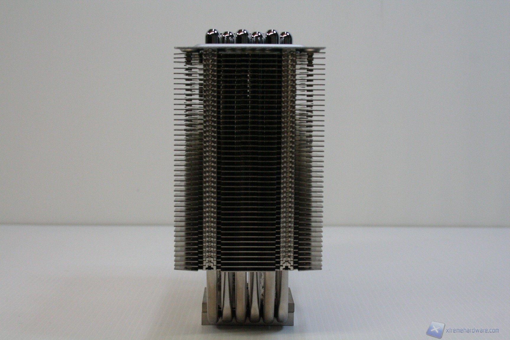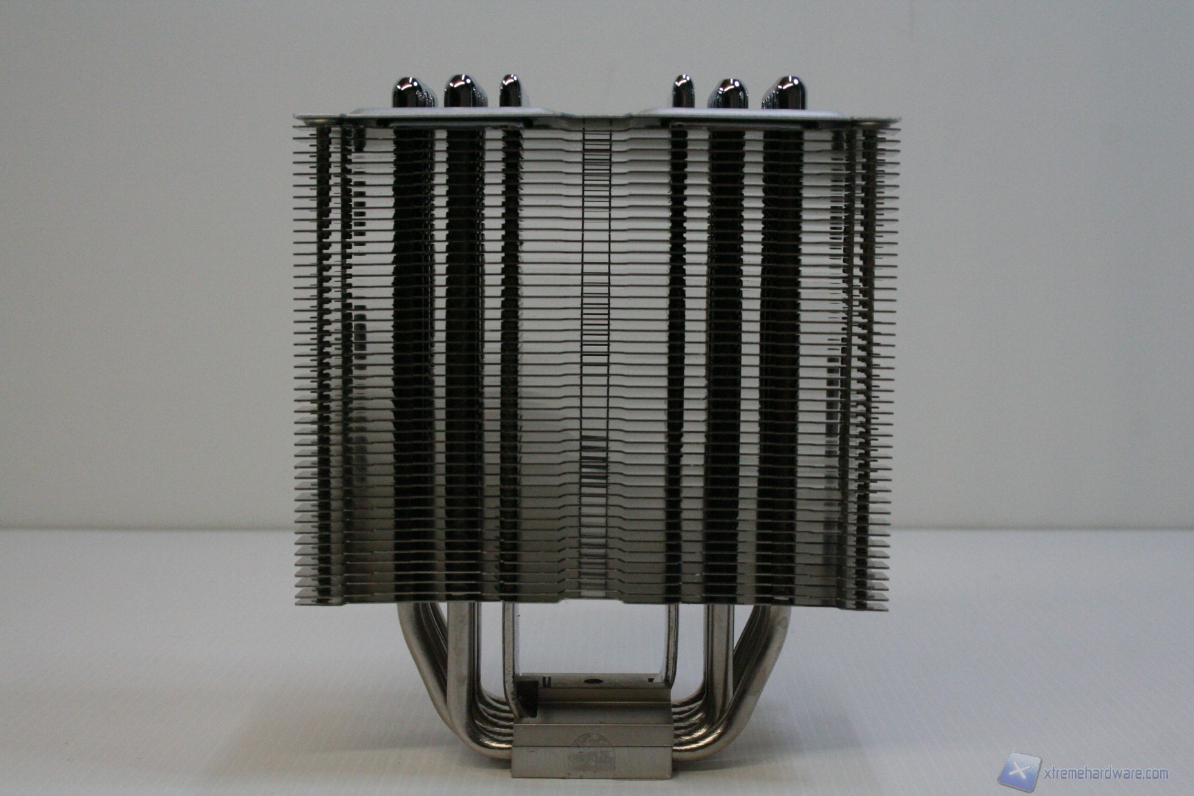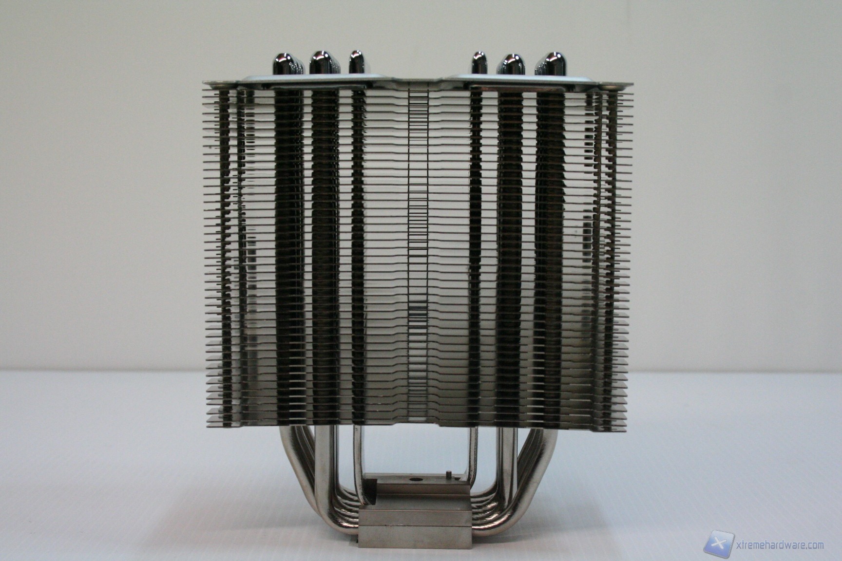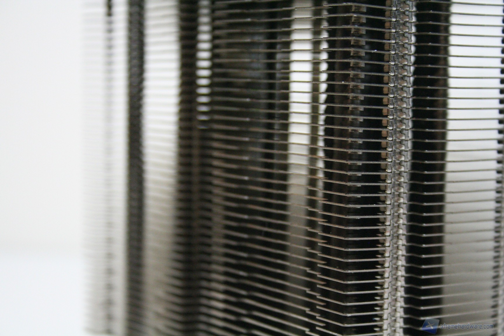 La struttura fa parte della classica tipologia a singola torre di raffreddamento ovvero con un corpo dissipante centrale, ed annesse heatpipes, in posizione verticale; il design sembra essere standard in quanto il posizionamento delle componenti sembra essere conservativo, ma si evince fin da subito qualche elemento interessante ovvero la presenza di due strane placche laminari al centro della struttura, poi una nickelatura che ricopre l’intero dissipatore, e l’immediata sensazione di robustezza del modello, le cui saldature infatti sono eccellenti e di elevatissima qualità. Sono presenti ben 44 alette, molto spesse e discretamente lunghe, che sono saldate alle 6 heatpipes di classica concezione, e che sono a contatto anche con le camere di vapore nella porzione centrale dell’unità.