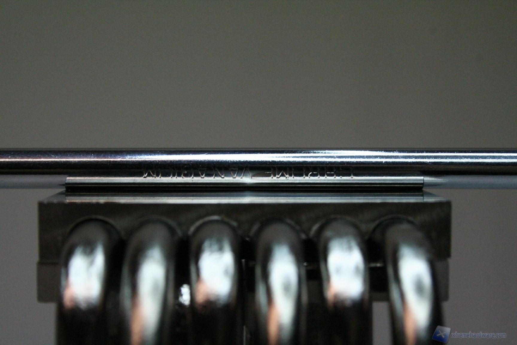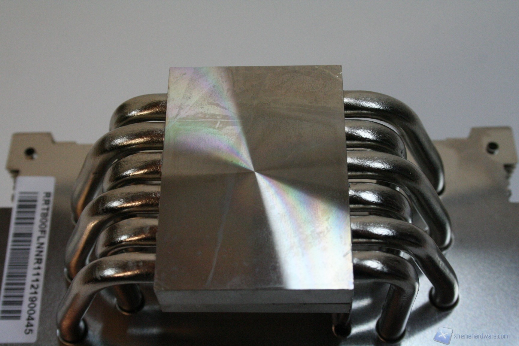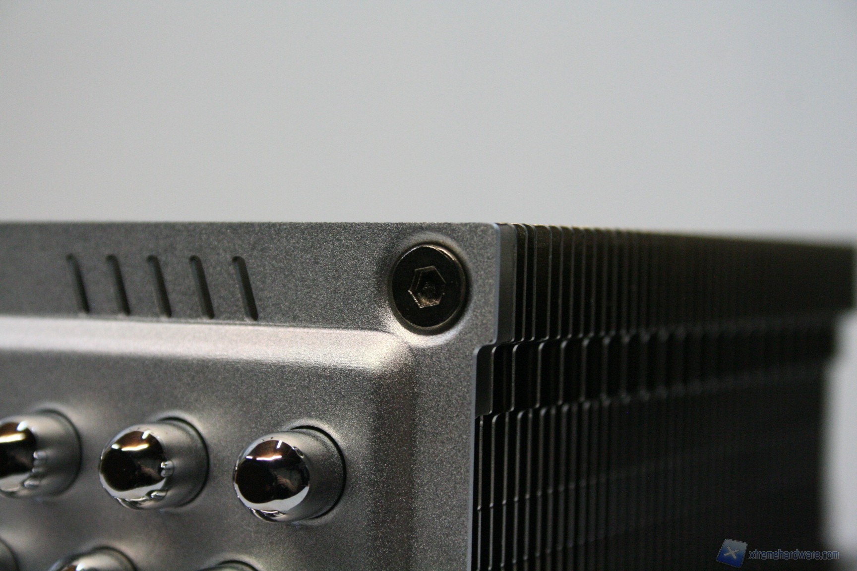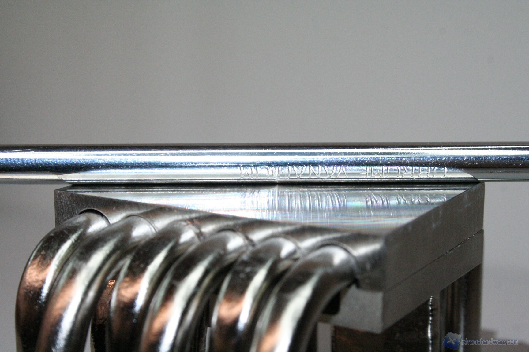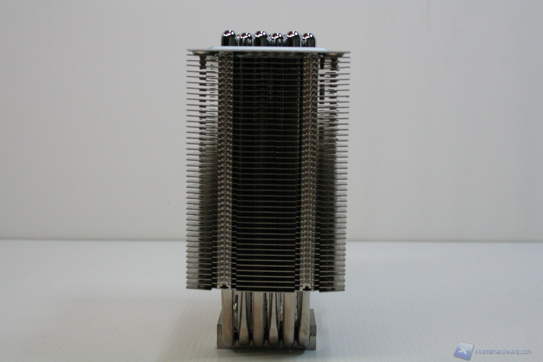 La struttura fa parte della classica tipologia a singola torre di raffreddamento ovvero con un corpo dissipante centrale, ed annesse heatpipes, in posizione verticale; il design sembra essere standard in quanto il posizionamento delle componenti sembra essere conservativo, ma si evince fin da subito qualche elemento interessante ovvero la presenza di due strane placche laminari al centro della struttura, poi una nickelatura che ricopre l’intero dissipatore, e l’immediata sensazione di robustezza del modello, le cui saldature infatti sono eccellenti e di elevatissima qualità. Sono presenti ben 44 alette, molto spesse e discretamente lunghe, che sono saldate alle 6 heatpipes di classica concezione, e che sono a contatto anche con le camere di vapore nella porzione centrale dell’unità.
