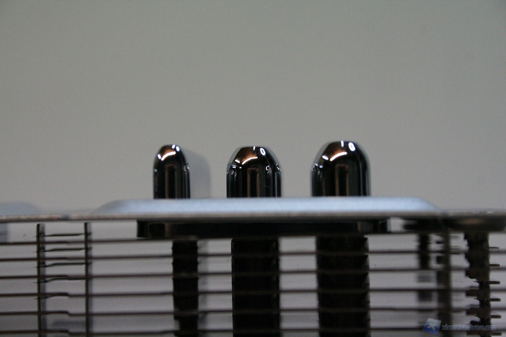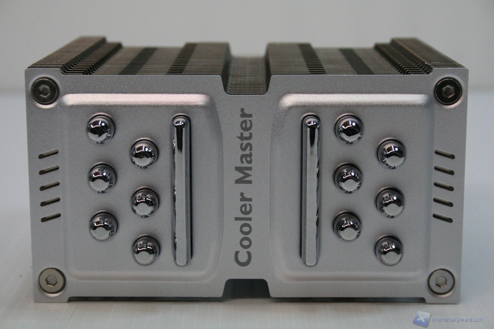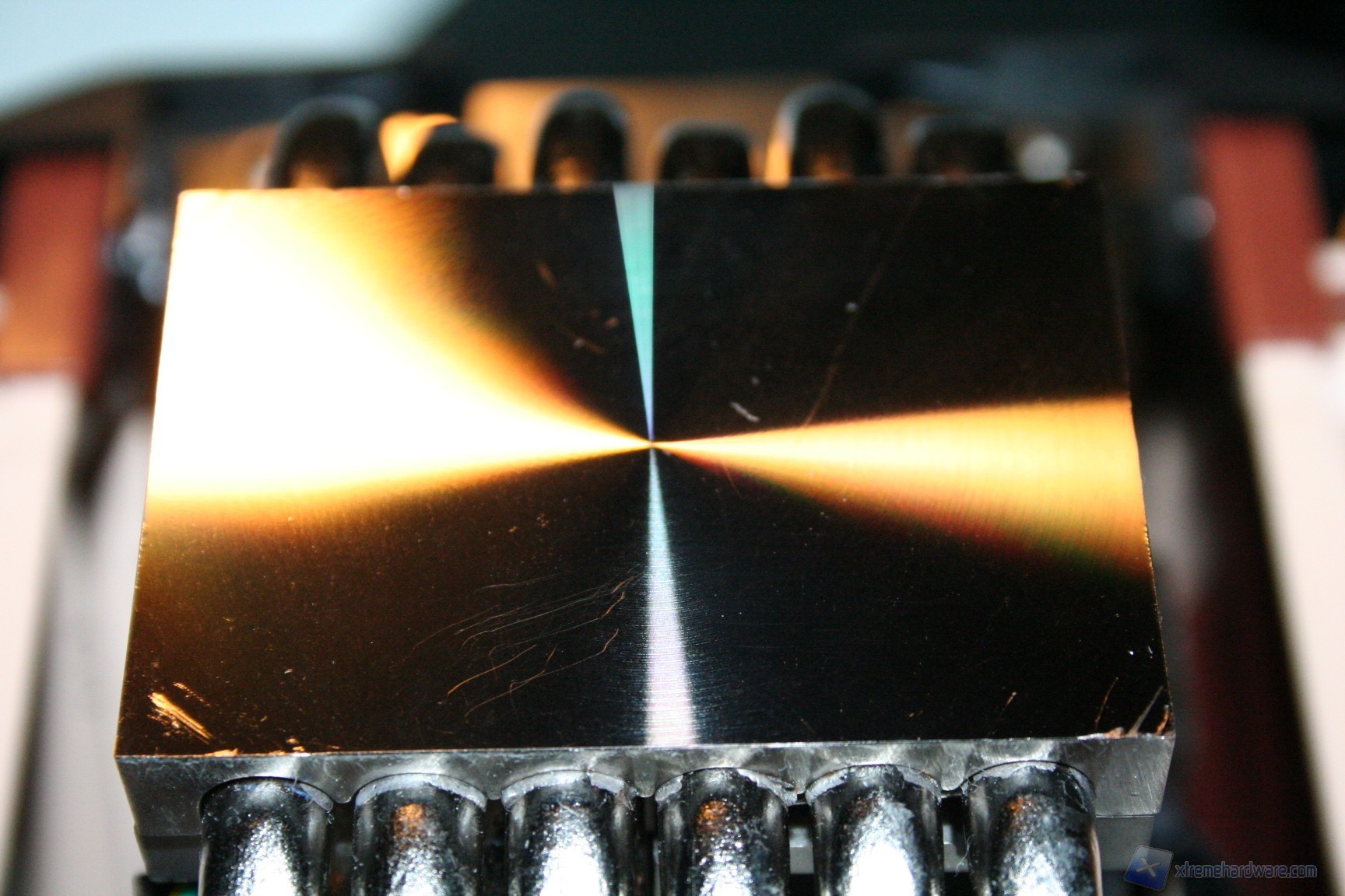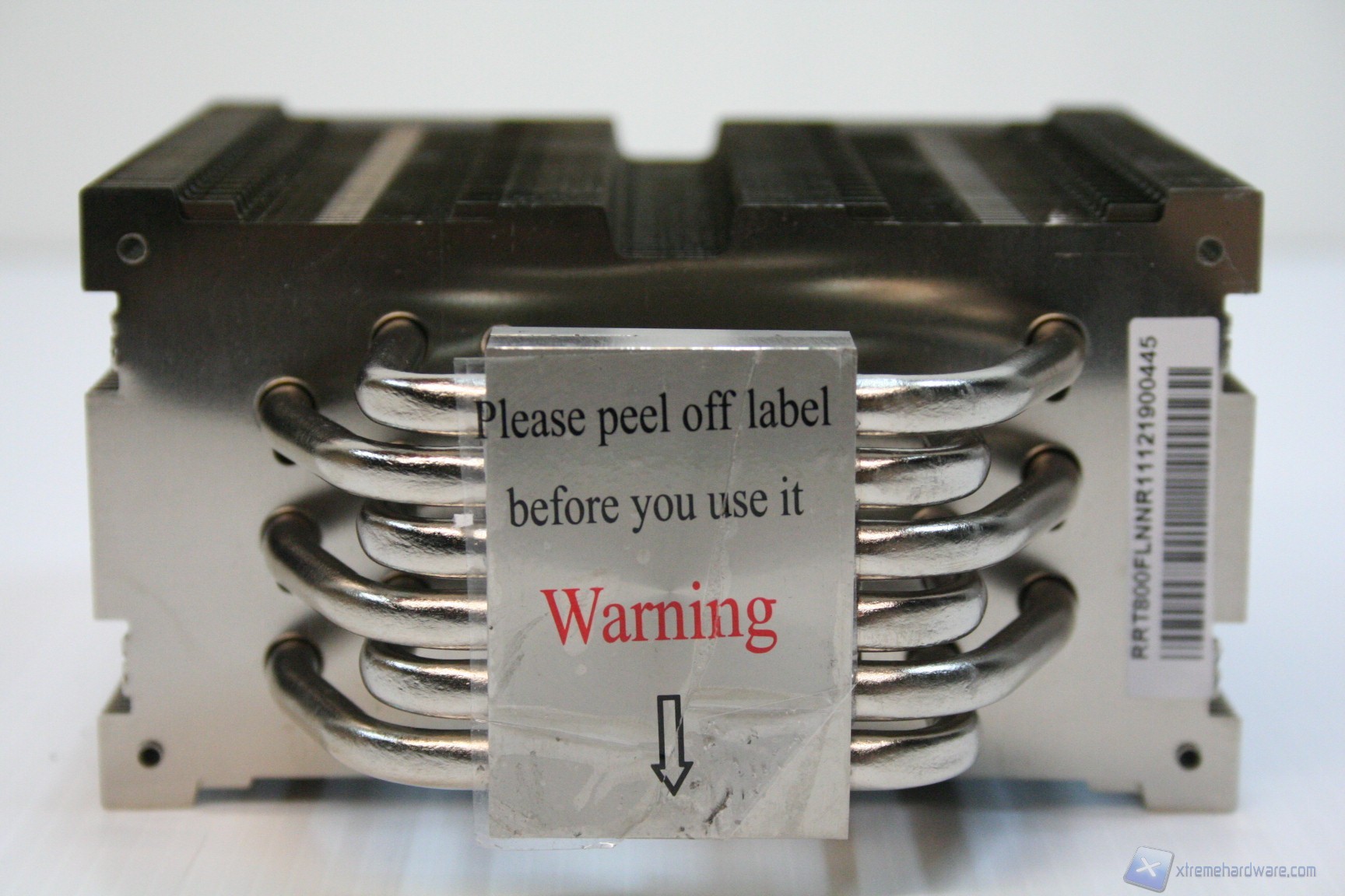 La struttura fa parte della classica tipologia a singola torre di raffreddamento ovvero con un corpo dissipante centrale, ed annesse heatpipes, in posizione verticale; il design sembra essere standard in quanto il posizionamento delle componenti sembra essere conservativo, ma si evince fin da subito qualche elemento interessante ovvero la presenza di due strane placche laminari al centro della struttura, poi una nickelatura che ricopre l’intero dissipatore, e l’immediata sensazione di robustezza del modello, le cui saldature infatti sono eccellenti e di elevatissima qualità. Sono presenti ben 44 alette, molto spesse e discretamente lunghe, che sono saldate alle 6 heatpipes di classica concezione, e che sono a contatto anche con le camere di vapore nella porzione centrale dell’unità.