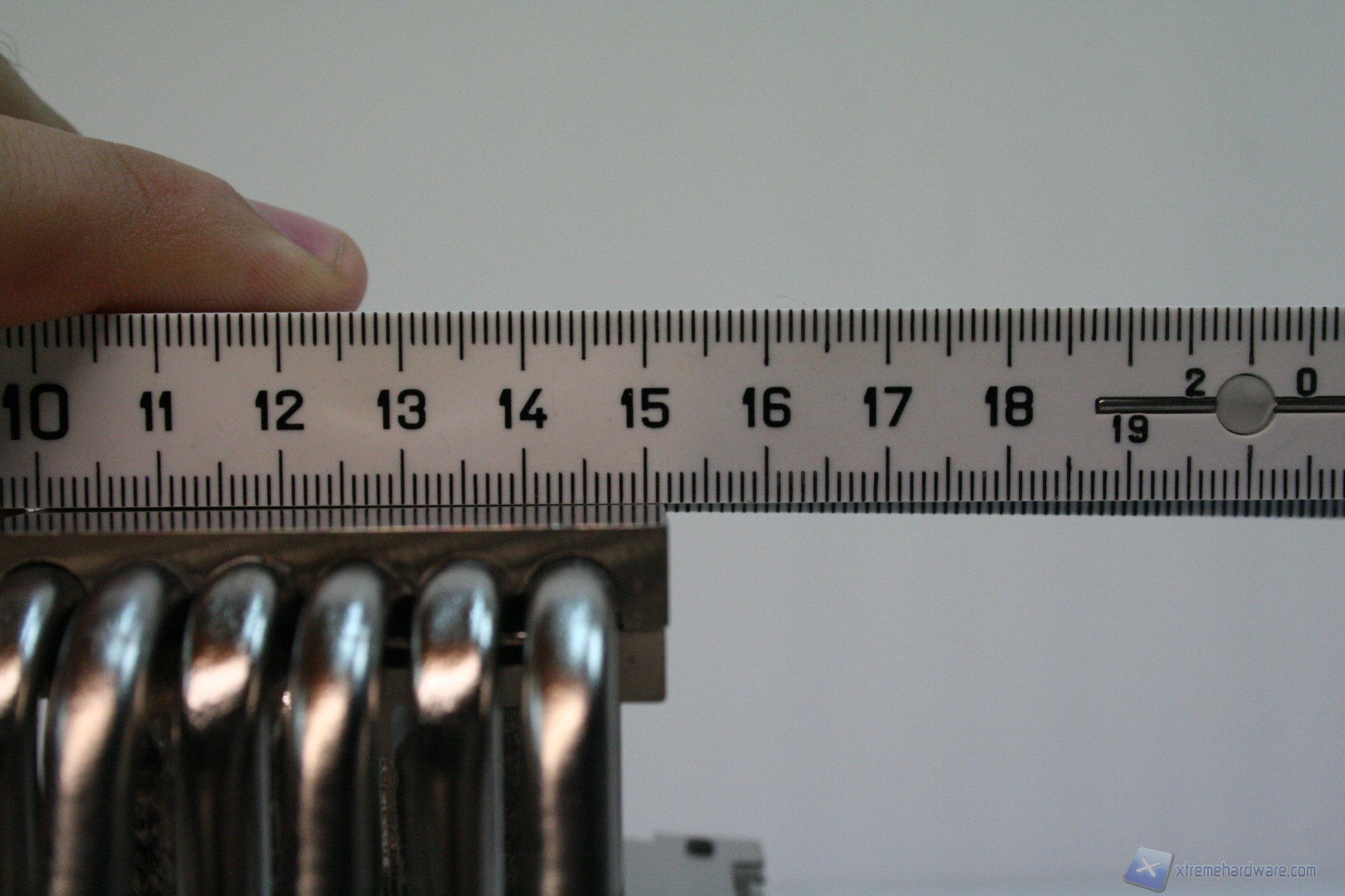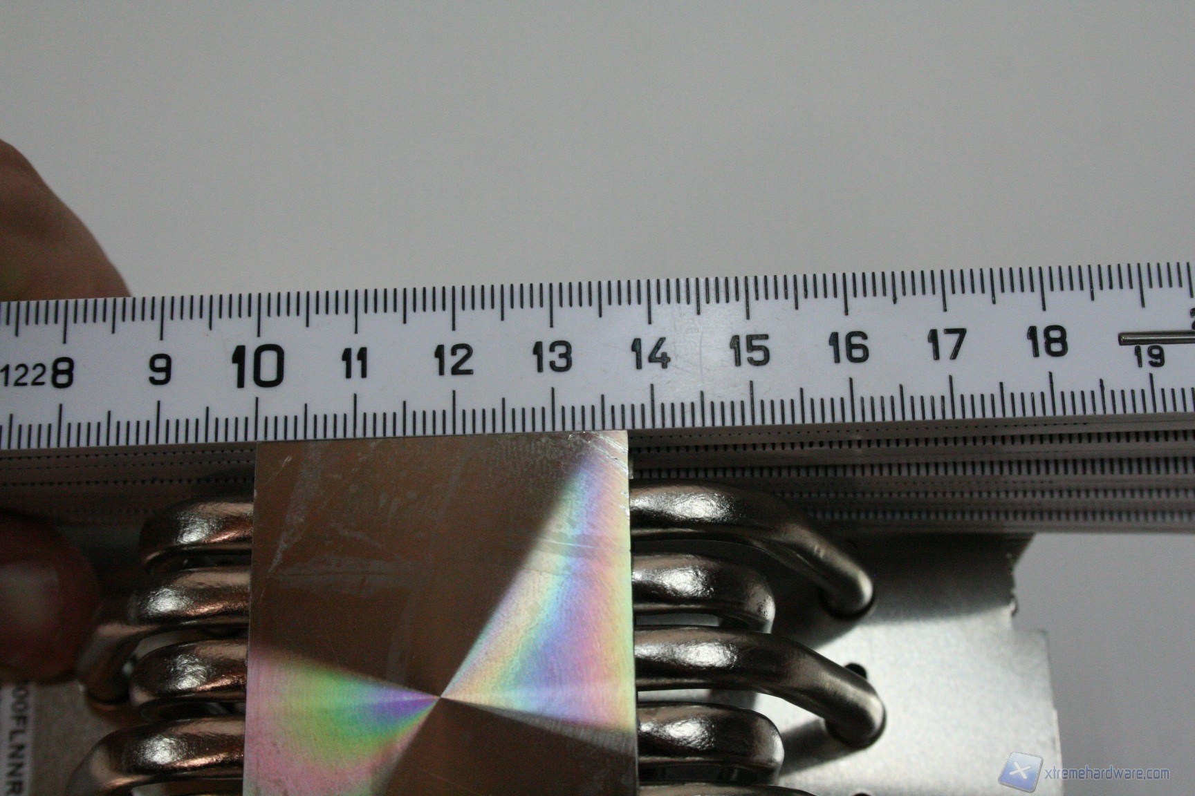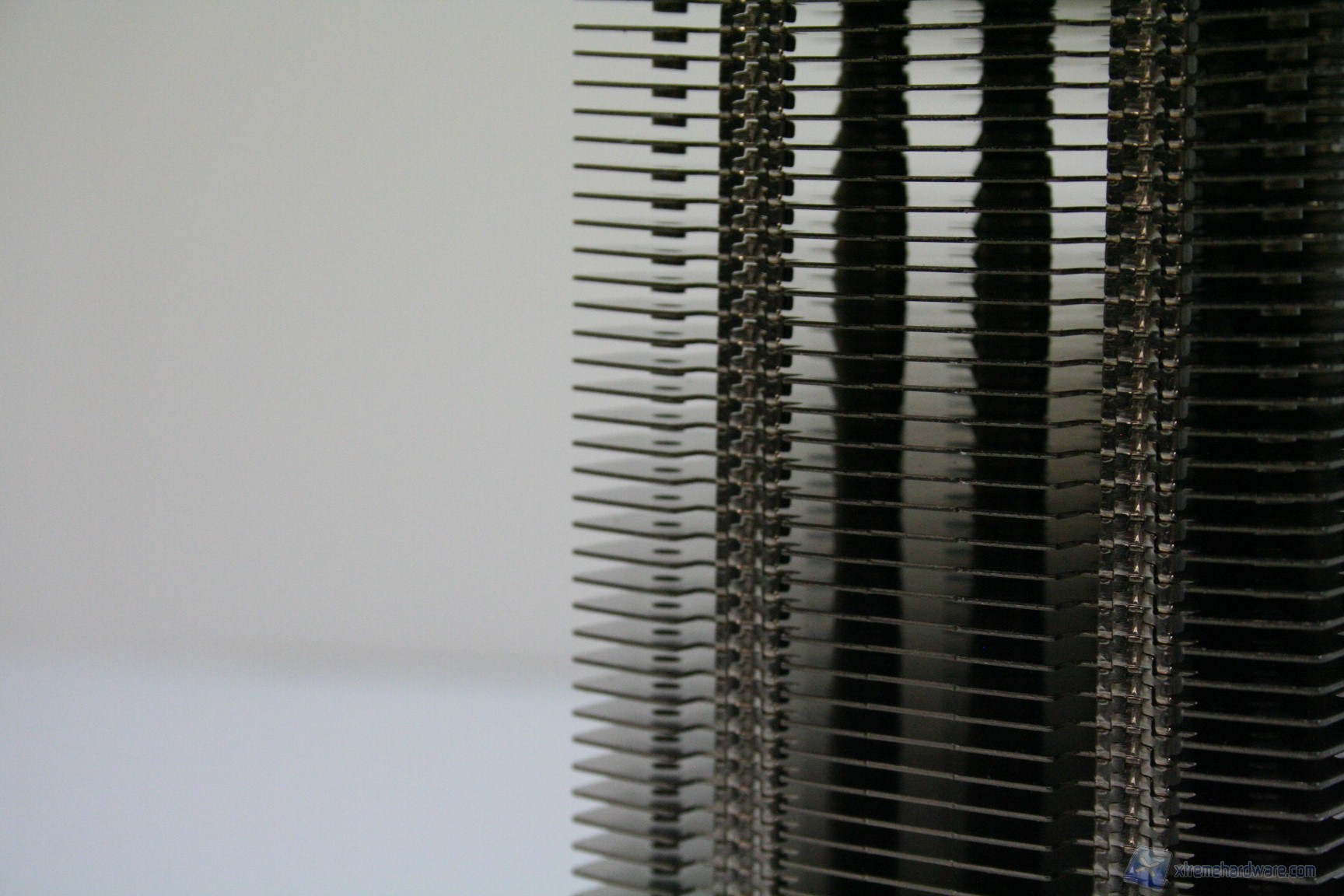 Al fine di migliorare la ventilazione centrale è presente una rientranza, presente anche nelle parti sinistra e destra ma con una profondità minore. La spaziatura delle alette è di 1.8mm, un valore contenuto che quindi permetterà ottime performance con ventole dall’elevata pressione statica, o elevatissimi CFM. Lo spessore invece è circa di 0.4mm, un valore medio-grande.