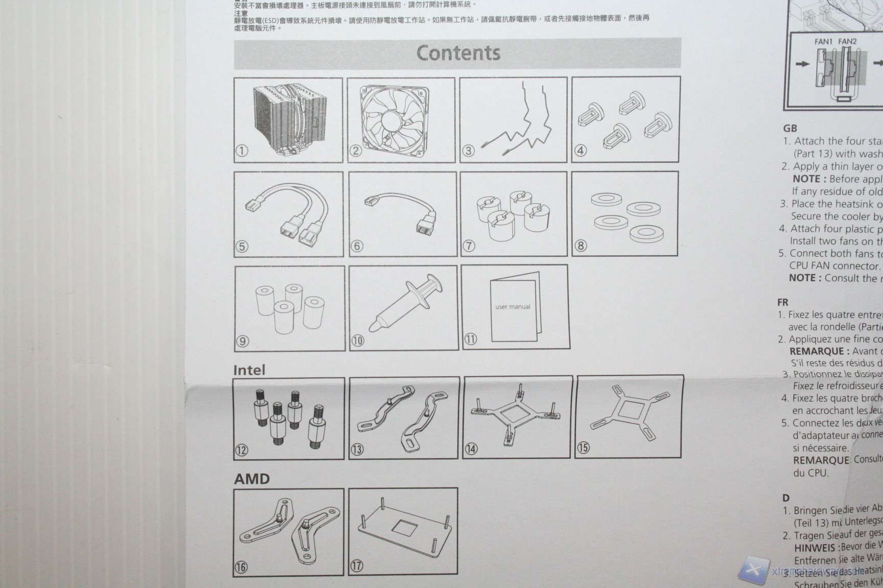 NB: nella fotografia ufficiale manca la seconda ventola da 140mm e due staffe, fornite nella confezione che abbiamo ricevuto. Riportiamo le foto dettagliate del manuale: