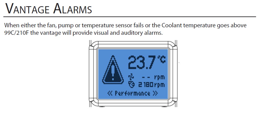 Il sistema è dotato di allarme sonoro e visivo, quando o la pompa o la ventola smettono di funzionare o quando la temperatura del liquido supera i 99°C/210°F.