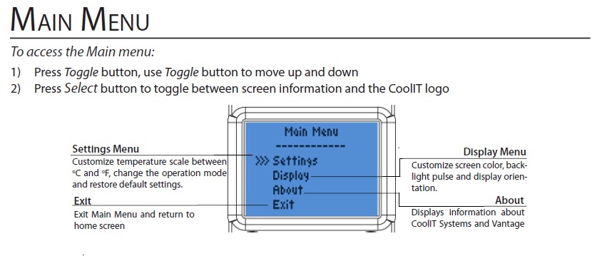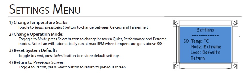 Il menù Setting ci permette di scegliere la scala di temperature tra Celsius e Fahrenheit, cambiare il modo di funzionamento da Quiet fino ad Extreme, dove in questo modo la ventola superati i 55° andrà al massimo dei regimi. Permette inoltre di ripristinare le impostazioni di fabbrica.