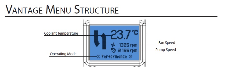 La prima schermata ci indica la temperatura del liquido di raffreddamento, velocità della ventola, velocità pompa e modalità di funzionamento (Quiet, Performance, Extreme)