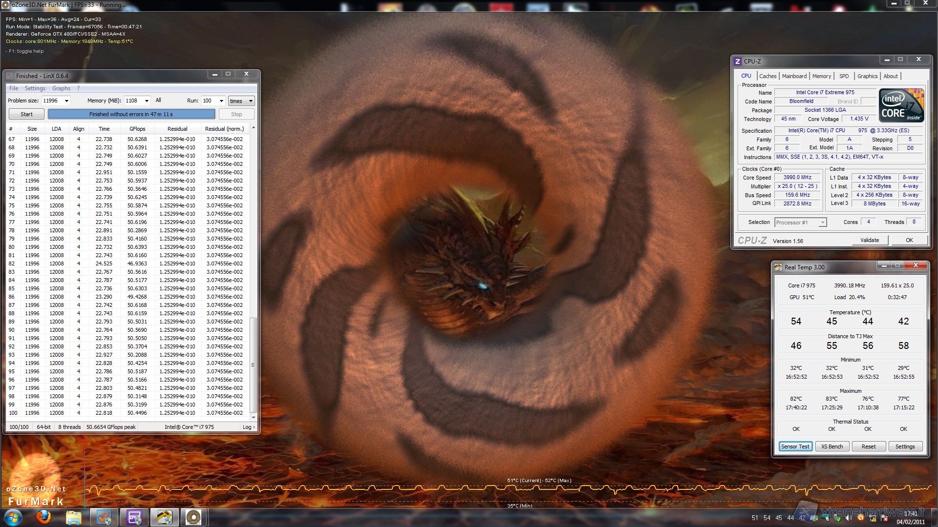 Per la VGA abbiamo usato, come detto, Furmark in modalità Burst (test di stabilità) a risoluzione FullHD 1920x1080. Lo screen seguente è un esempio di come i due programmi di stress siano stati fatti girare contemporaneamente.