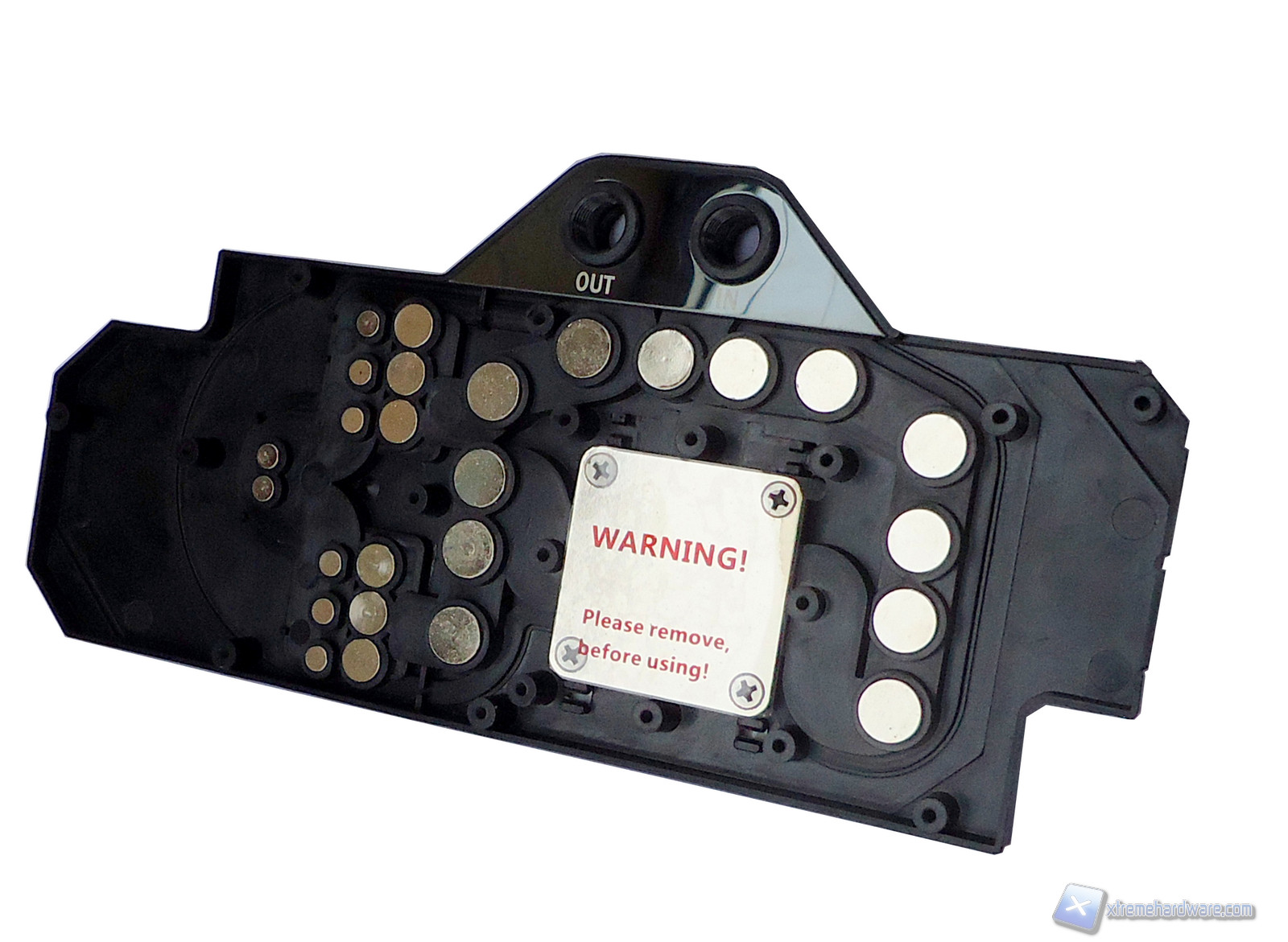 Nella parte superiore l'Alphacool NexXxoS NVXP Nvidia GTX780/Titan presenta due ingressi e due uscite filettati secondo lo standard G1/4, contraddistinti dalle scritte IN e OUT. Ovviamente ne vanno utilizzate solo due, chiudendo quelle inutilizzate con i tappi in dotazione. Questo permette di fare configurazioni diverse a seconda di come ci tornerà più comodo nel nostro impianto a liquido.