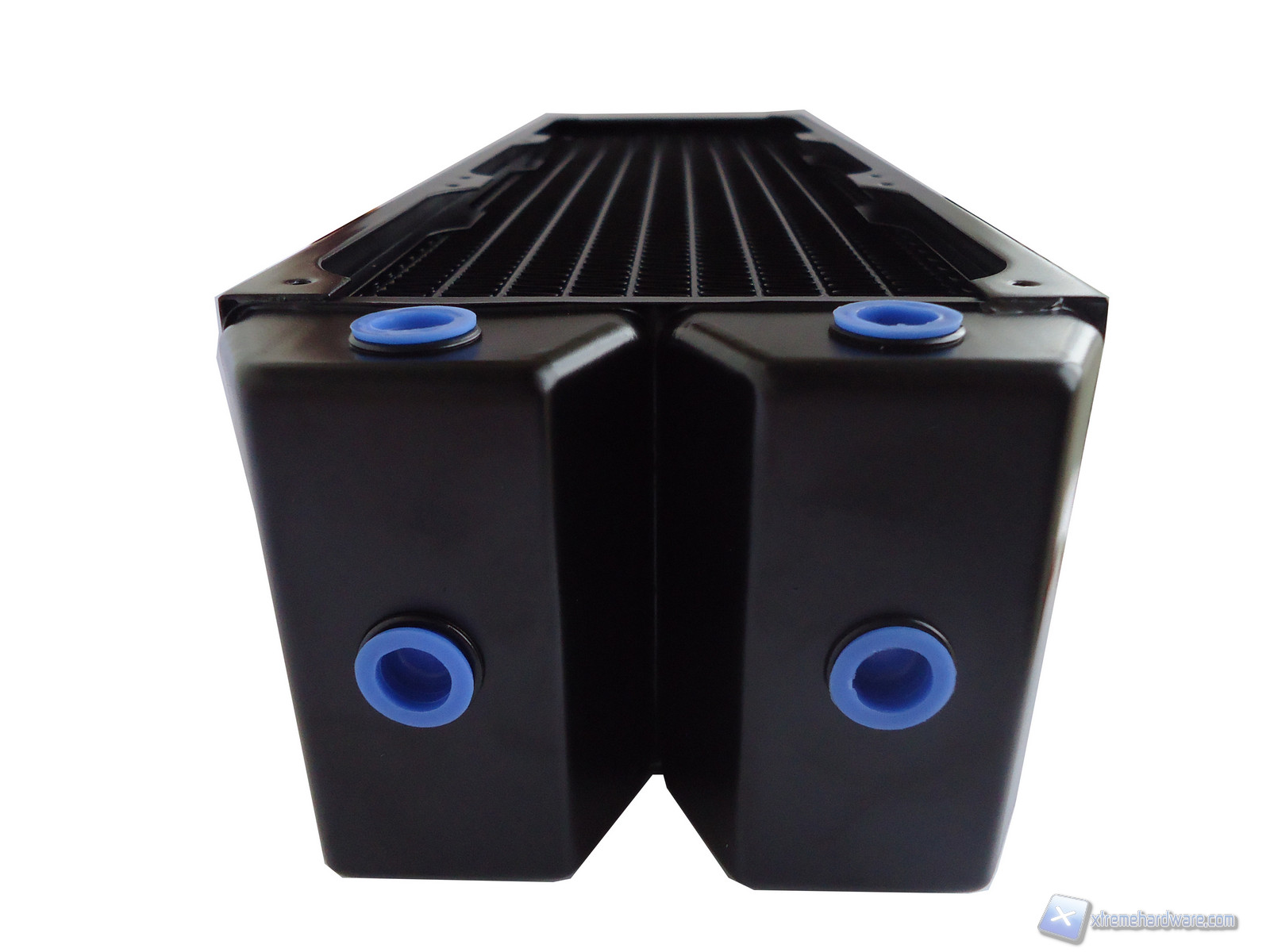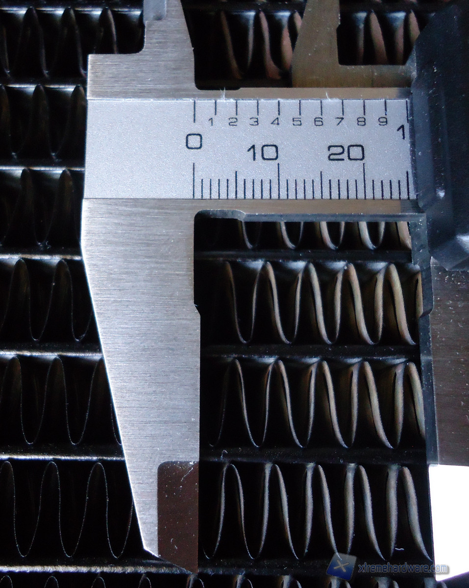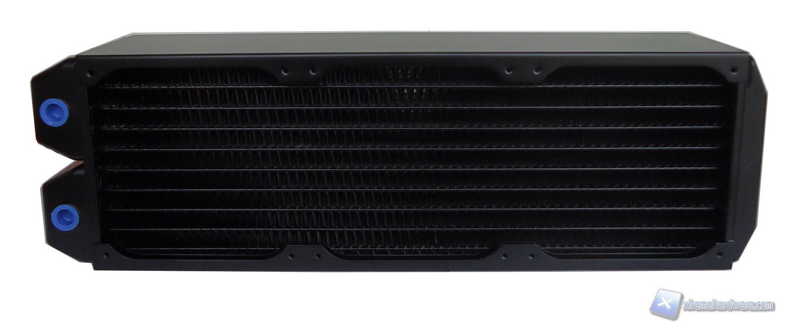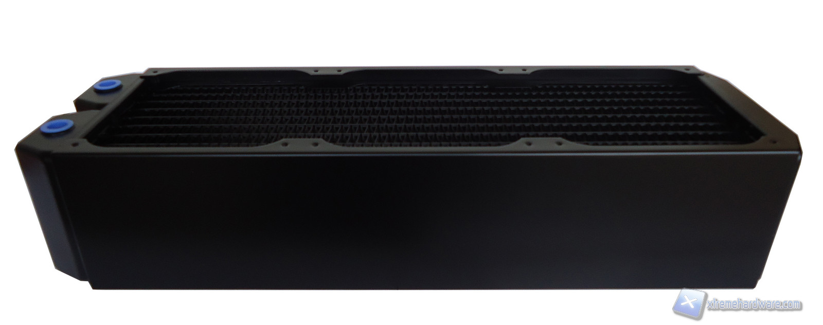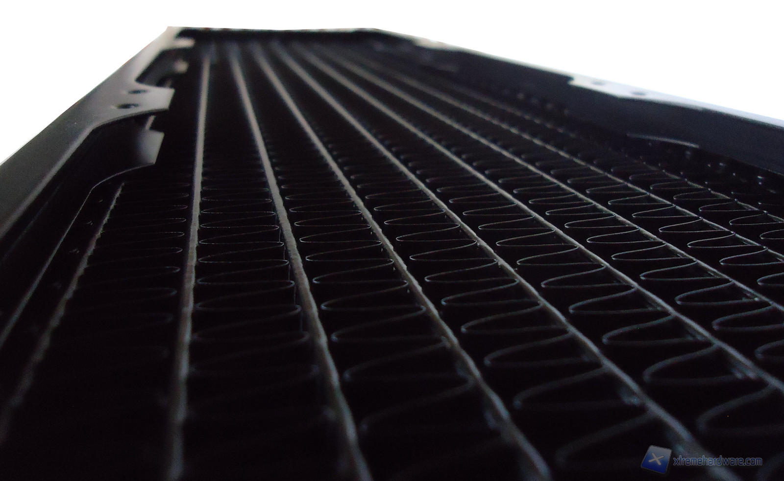 La densità delle lamelle è pari a 11 FPI (fins per inch) e come detto in precedenza sono presenti su ogni lato 12 filettature M3 per permettere l’installazione di 3 ventole per ogni lato per un totale di 6 in un’eventuale configurazione push-pull. In questa configurazione il radiatore raggiunge lo spessore di ben 130mm: riuscire ad installarlo all’interno di un cabinet è tutt’altro che banale. Noi ci “limiteremo” a testarlo in configurazione push, in uno dei pochi cabinet in grado di accoglierlo.