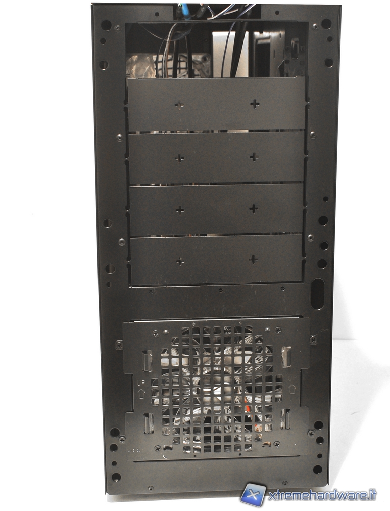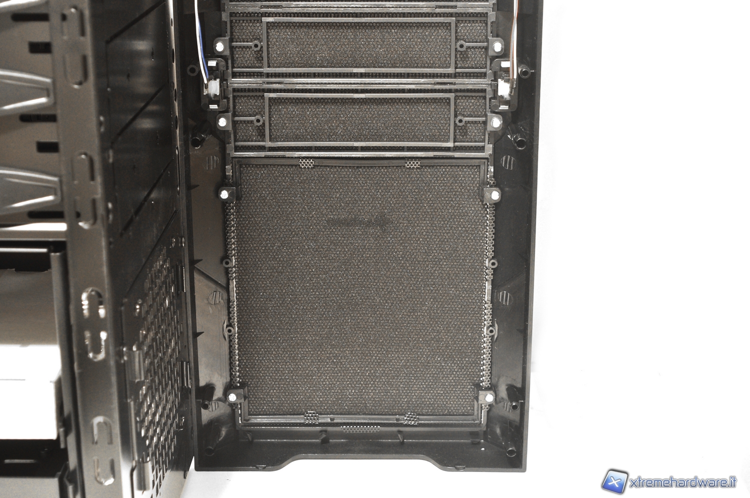 Removing the front mask with a light traction, we can better see the 5.25" bay covers in t at the bottom and 120mm fan. It’s worth noting that the dust filter of the fan is not placed in the structure of the case, but in the bulkhead removable. Similarly, all mesh covers come with internal dust filter.