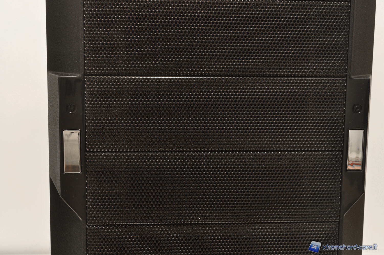 In the central part of the cabinet, on both sides, there are two rectangular buttons that are used to power on and to reset the computer.