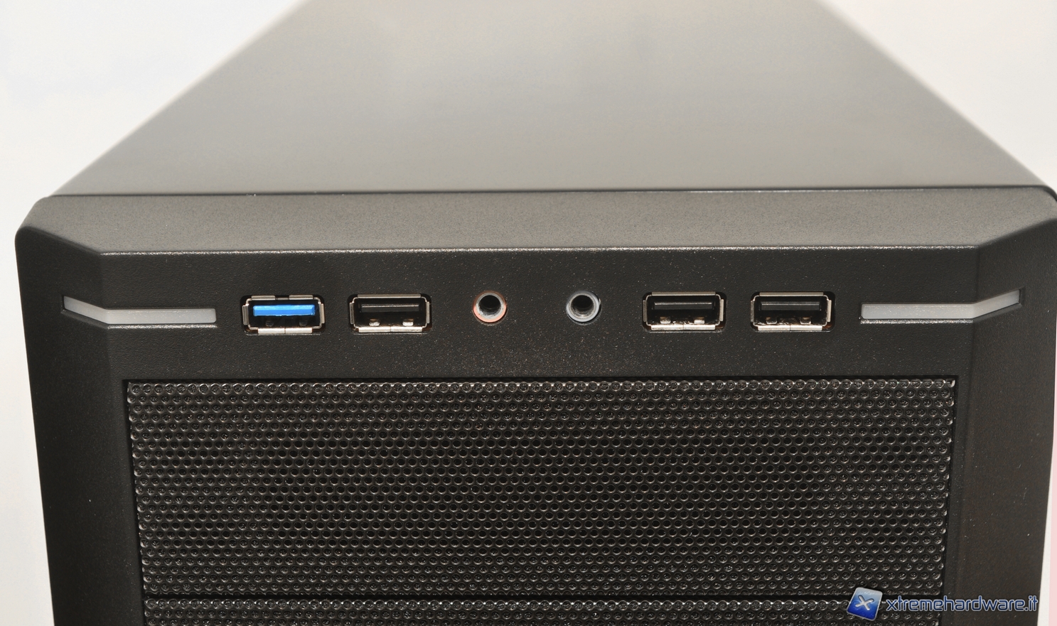 At the top of the front panel, on both sides, there are two status indicators: the HDD LED and the Power ON LED. Starting from the left, there are a USB 3.0 port, a USB 2.0 port, microphone jack, headphone jack and 2 more USB 2.0 ports.