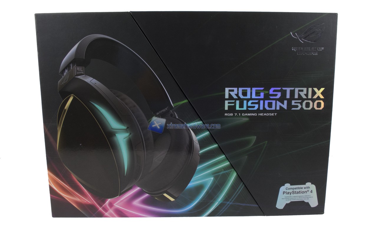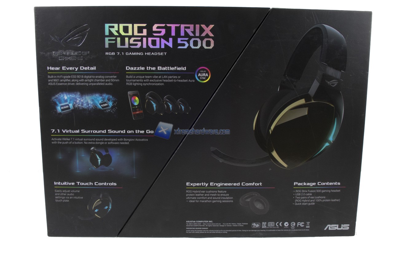 Le ASUS ROG Strix Fusion 500 sono ospitate in una confezione di cartone di medie dimensioni con l’immancabile grafica e stile ASUS ROG. Non mancano diverse immagini illustrative e caratteristiche tecniche che campeggiano su tutti i lati della confezione.