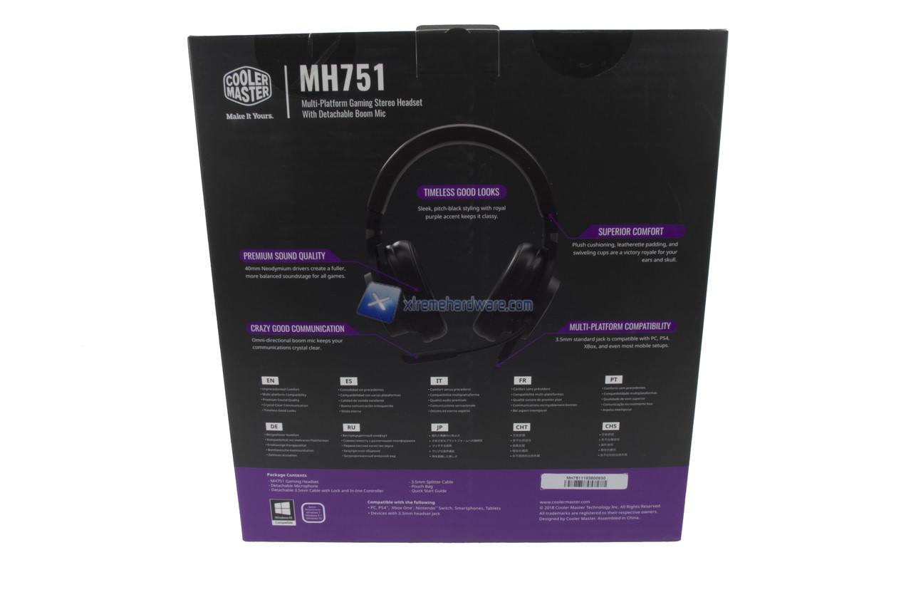 Le cuffie giungono in una classica confezione di cartone di medie dimensioni. I colori sono i classici Nero/Viola caratterizzanti il nuovo logo e set di periferiche di Cooler Master. La confezione e ben curata e riporta tutte le principali informazioni e immagini relative il prodotto.