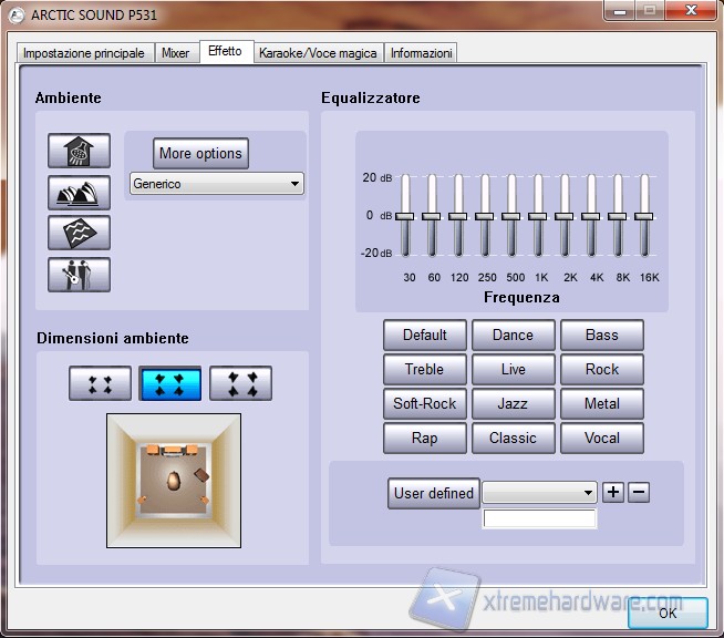 La terza schermata è dedicata agli effetti. Si può selezionare il tipo e le dimensioni dell’ambiente, inoltre a destra è presente l’equalizzatore, sottostante al quale sono presenti i generi musicali da applicare mentre ascoltiamo musica.