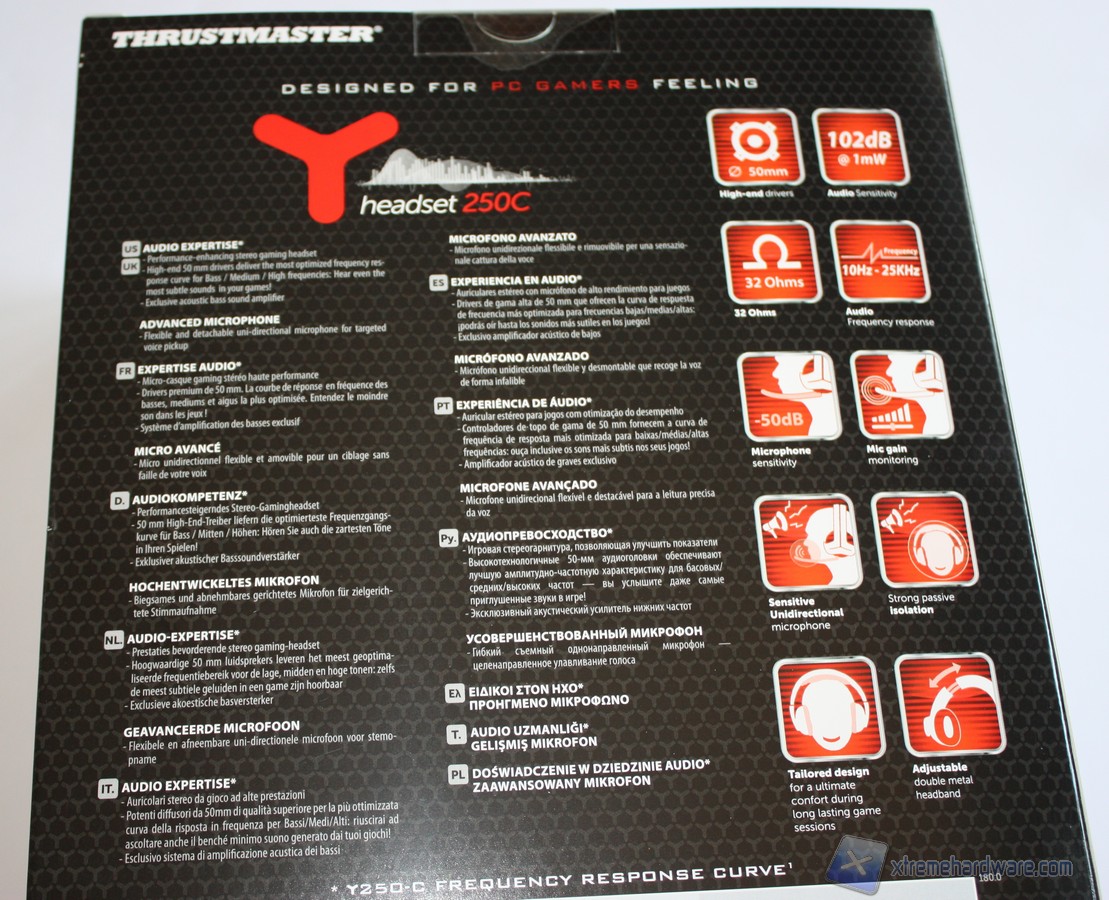 Nel retro della confezione troviamo ulteriori informazioni circa le specifiche tecniche dell’headset, una breve descrizione delle caratteristiche principali in varie lingua tra cui l’italiano ed un grafico sulla circa del Frequency Response di questo headset.