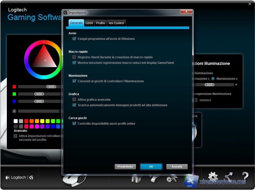Infine dal Menù delle impostazioni potremo agire su alcune opzioni di avvio del programma, di gestione di colore e retroilluminazione a seconda del gioco, di controllare la disponibilità di un nuovo firmware o usufruire dell’Arx Control tramite smartphone.