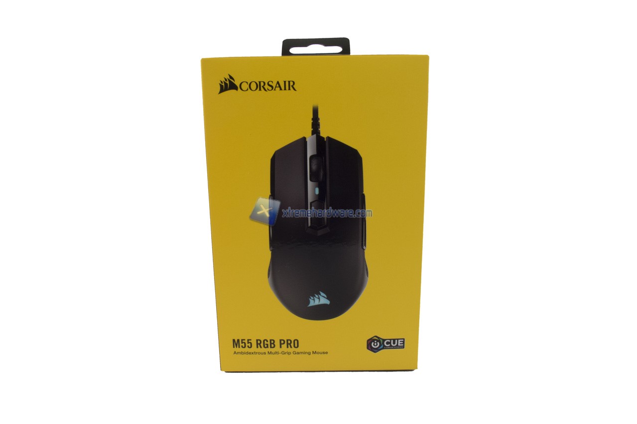 Il Corsair M55 RGB Pro giungerà nuovamente nell’ormai nota e conosciuta confezione di cartone. Confezione nella classica colorazione Giallo/Nero. La confezione riporta tutte le principali informazioni e diverse immagini illustrative del prodotto.