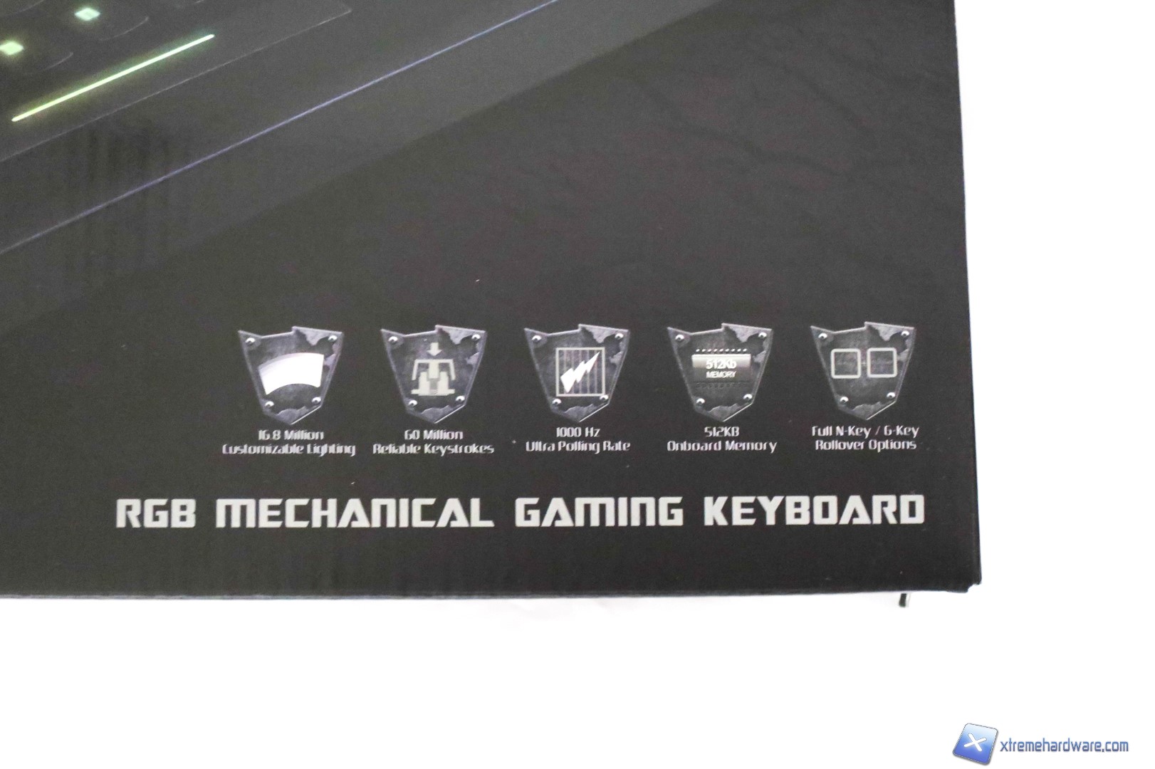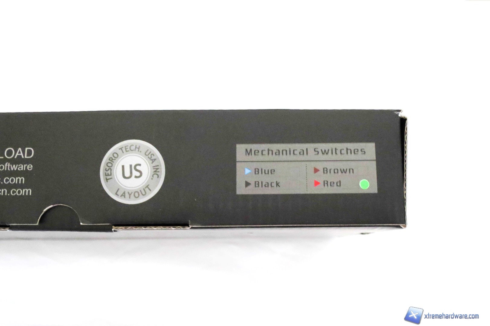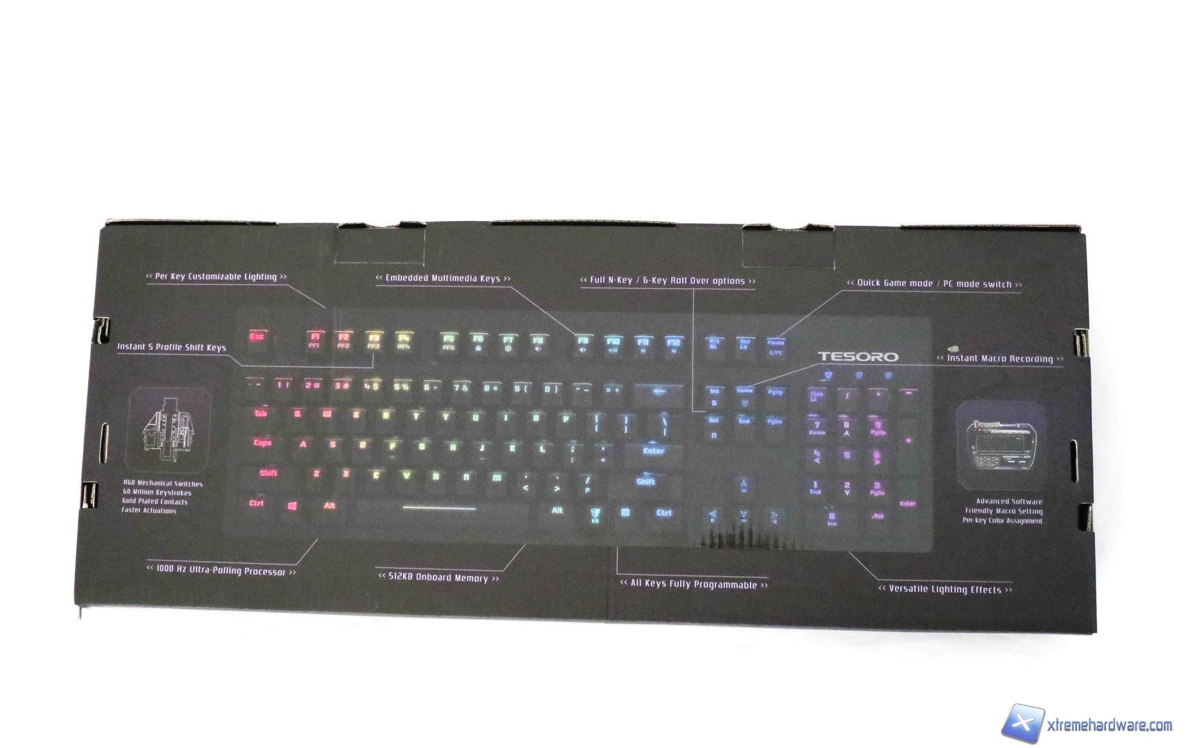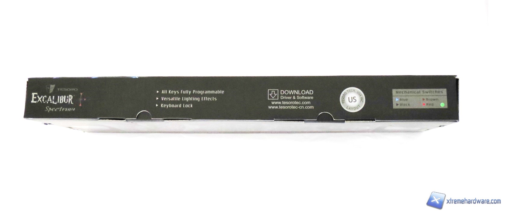 Per la Excalibur Spectrum, Tesoro adotta la classica confezione in cartone sulla quale troviamo la grafica tipica dei prodotti Tesoro. Con la Spectrum, troviamo un’immagine illustrativa del prodotto con le solite caratteristiche sintetizzate in loghi e brevi accenni ad essi nonché il logo “Spectrum” che ci proietta subito la tipologia e la principale caratteristica della tastiera, la retroilluminazione a spettro. E’ presente infatti una retroilluminazione a più colori (in teoria 16mln) personalizzabile per i singoli tasti.