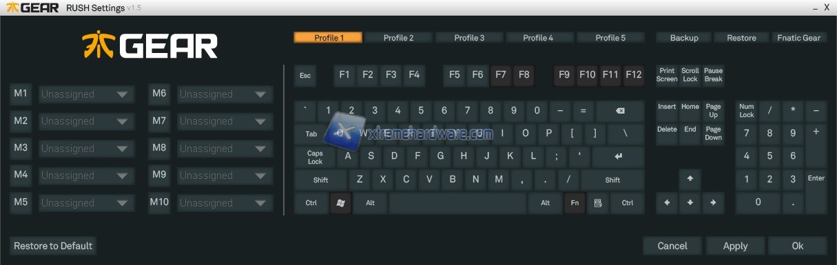 La GUI del software della tastiera RUSH è davvero semplice e immediata. Avremo una grafica personalizzata per il dato prodotto con tutti i riferimenti alla Fnatic Gear. Software inoltre diviso, se così possiamo dire, in due aree di cui a sinistra presente una sorta di tastiera con tasti virtuali denominati M1-M10 e a destra sempre una tastiera virtuale con tutti i singoli tasti fisici presenti sulla tastiera.