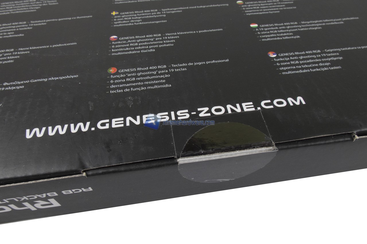 La Genesis Rhod 400 RGB è ospitata in una confezione di cartone di medie dimensioni. Su di questa troviamo alcune immagini illustrative e le principali caratteristiche in diverse lingue ad eccezione di quella italiana essendo il brand da poco approdato nel mercato nostrano.