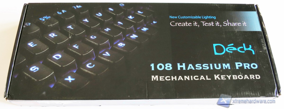 La confezione della Deck Hassium Pro è realizzata in cartone con finitura lucida e sono riportate le varie informazioni base circa la tastiera e la tipologia. Nella parte frontale troviamo un’immagine illustrativa della tastiera retroilluminata con modello, brand e motto che recita “Create it, Test it, Share it”.