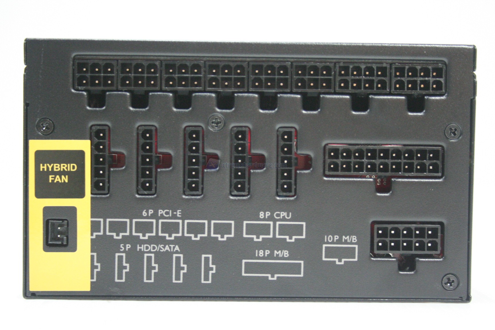 Un alimentatore generalmente non è una componente dedita a modding, il che significa che il suo layout esterno, salvo casi particolari, non richiede particolari accortezze. Per l’appunto, è questo il caso. Il telaio non presenta elementi di rilievo se non il nuovo logo della serie V con una finitura in alluminio spazzolato con colorazione argentata. La ventola, posta sotto alla scocca, presenta un diametro di 135mm. Il telaio è ordinario ma posteriormente sono presenti ingressi completamente modulari. E'presente uno sticker giallo che permette l'identificazione del connettore per il fan controller esterno. Oltre a questo, nella parte superiore, è presente il consueto sticker superiore che impedisce lo smontaggio dell’unità, pena la perdita della garanzia. Nella parte inferiore  è invece presente lo sticker delle specifiche tecniche. La verniciatura è ottima e non sono presenti sbavature od imperfezioni.