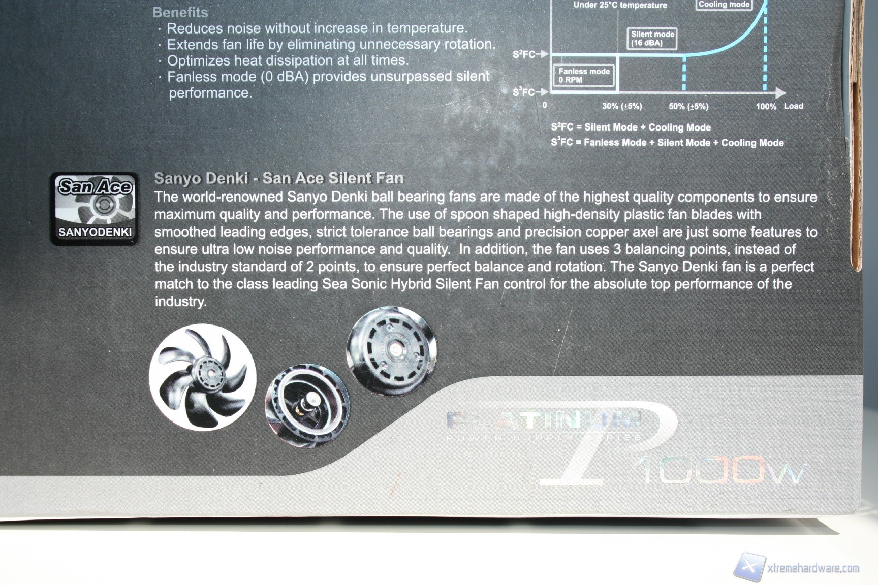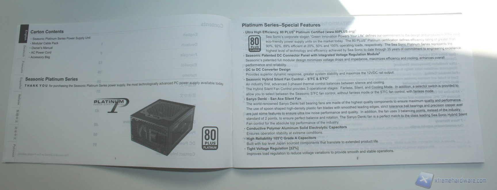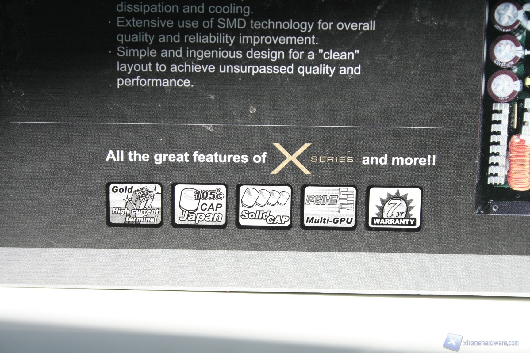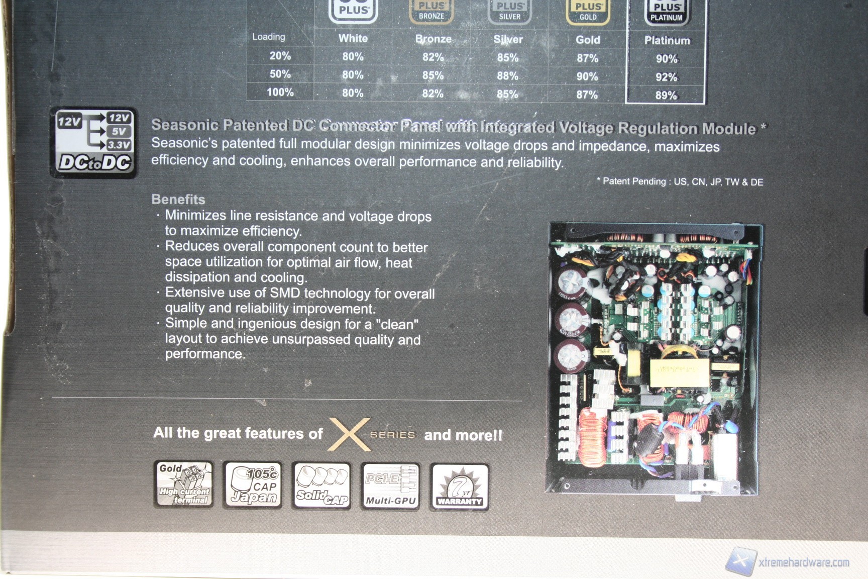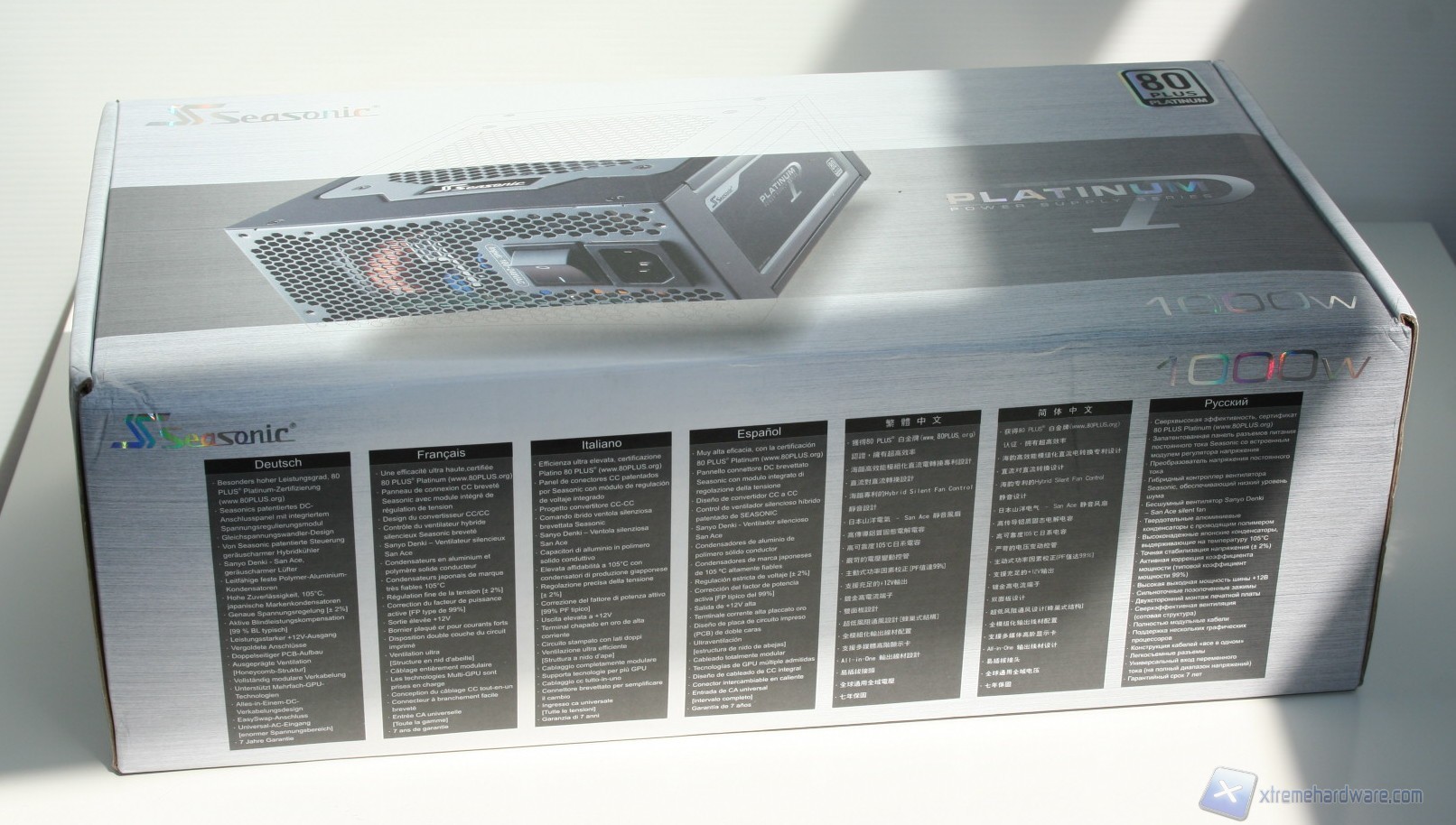 La confezione esterna è di medie dimensioni, dal layout decisamente ordinato, pulito ed elegante, sia nell’esposizione delle informazioni, che sono in gran numero e molto approfondite, sia nell’organizzazione interna delle componenti. La colorazione è grigio-azzurrina, con decalcomanie riflettenti la luce. Nella parte posteriore della confezione si può già apprezzare la qualità dei componenti adottati da Seasonic per questa soluzione, grazie a una fotografia interna del layout del PCB e delle componenti onboard con annessa spiegazione.