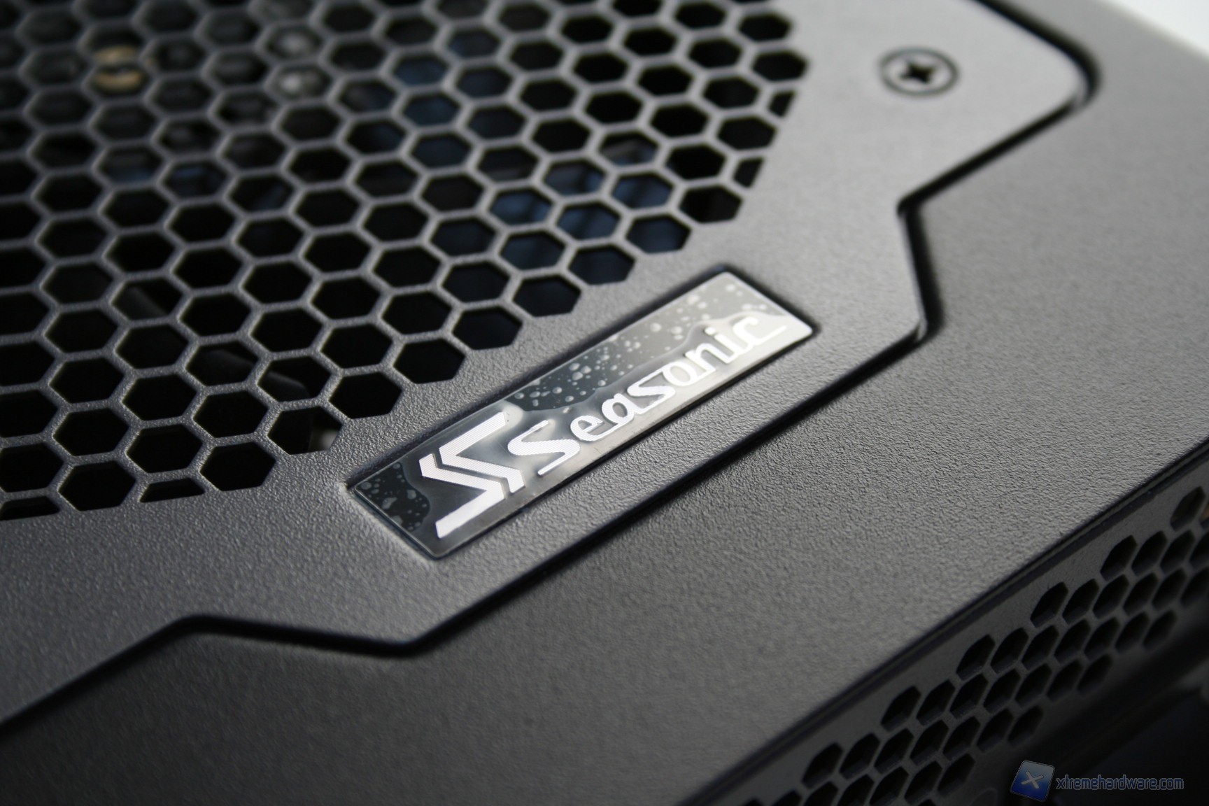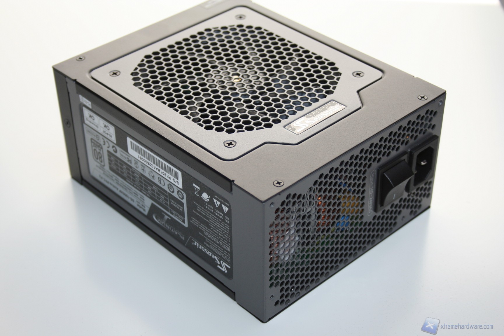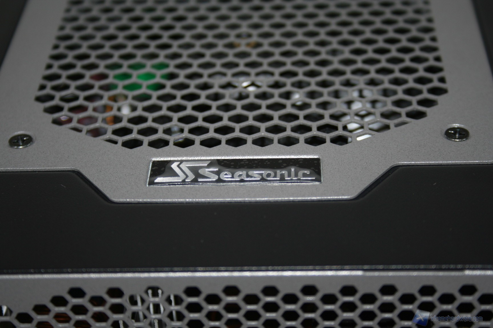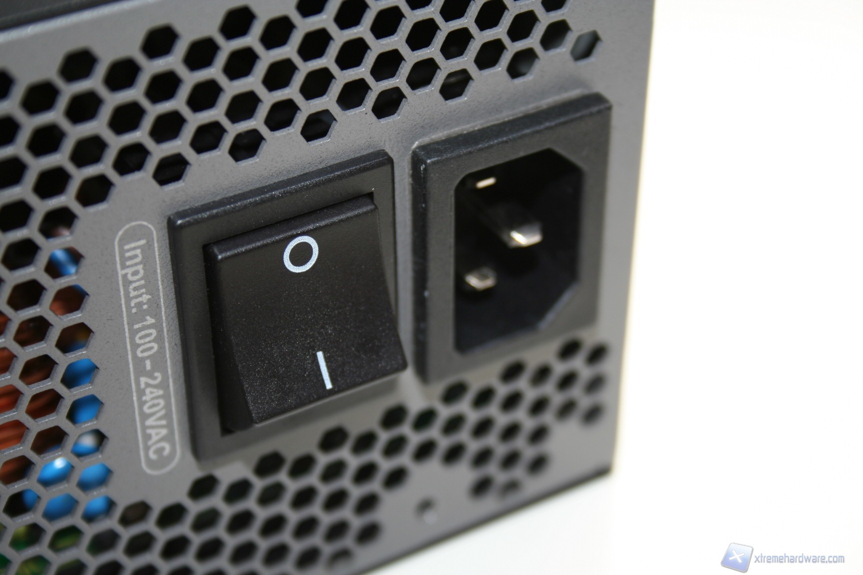 Posteriormente sono presenti invece le classiche fessure d’aerazione, esagonali a nido d’ape assieme all’ingresso della corrente, dove troviamo un posizionamento classico del pulsante di accensione; quest’ultimo però èdi dimensioni non standard, quindi maggiorato. La presenza di questa diversità rispetto agli altri modelli è un indice della ricercatezza assoluta dell’unità, Seasonic non ha puntato al risparmio per nessun componente.