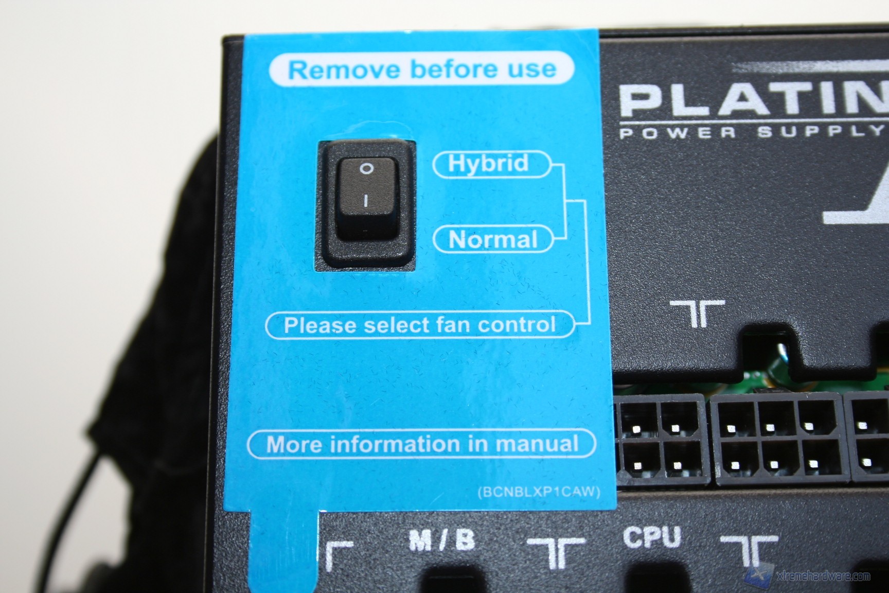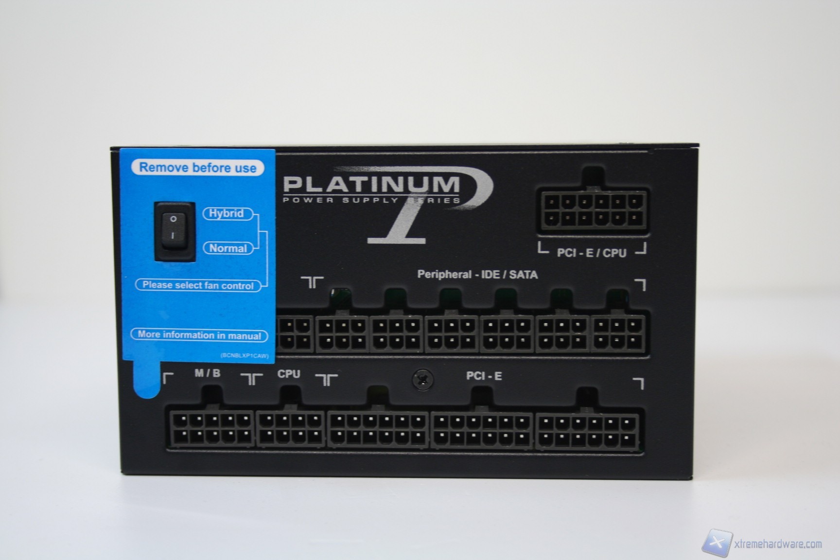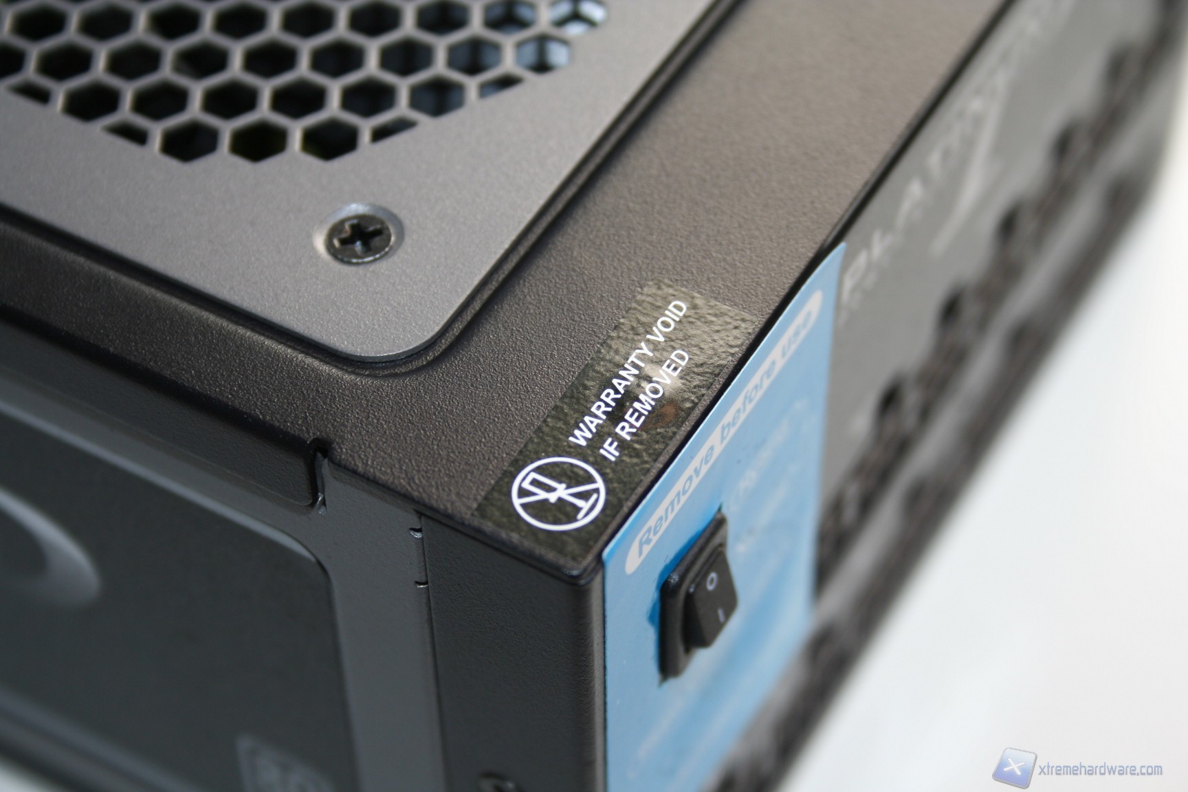 Nella parte interna invece troviamo i connettori di alimentazione supplementari, totalmente modulari, che permettono un ottimo cablaggio all’interno del cabinet ed allo stesso tempo una elevata espandibilità del sistema. Gli attacchi dei cavi addizionali non sono piatti bensì classici a 6/8 Pin, il che porta ad un ingombro contenuto, ma certamente maggiore rispetto alla tipologia low profile. Lateralmente, in alto, c’è uno sticker che segnala la perdita della garanzia della casa produttrice qualora dovesse essere rimosso o forato, per permettere lo smontaggio della scocca, cosa presente nella quasi totalità degli alimentatori attualmente in commercio. Inoltre è presente uno switch con annesso sticker che indica l’accensione o meno del sistema di ventilazione ibrido della ventola interna, caratteristica tecnica che da sola varrebbe l’acquisto di questo modello per via dell’estrema silenziosità in esercizio. Tale switch attiva una funzione davvero utile, anche se richiede l’apertura del cabinet per poter essere azionato.