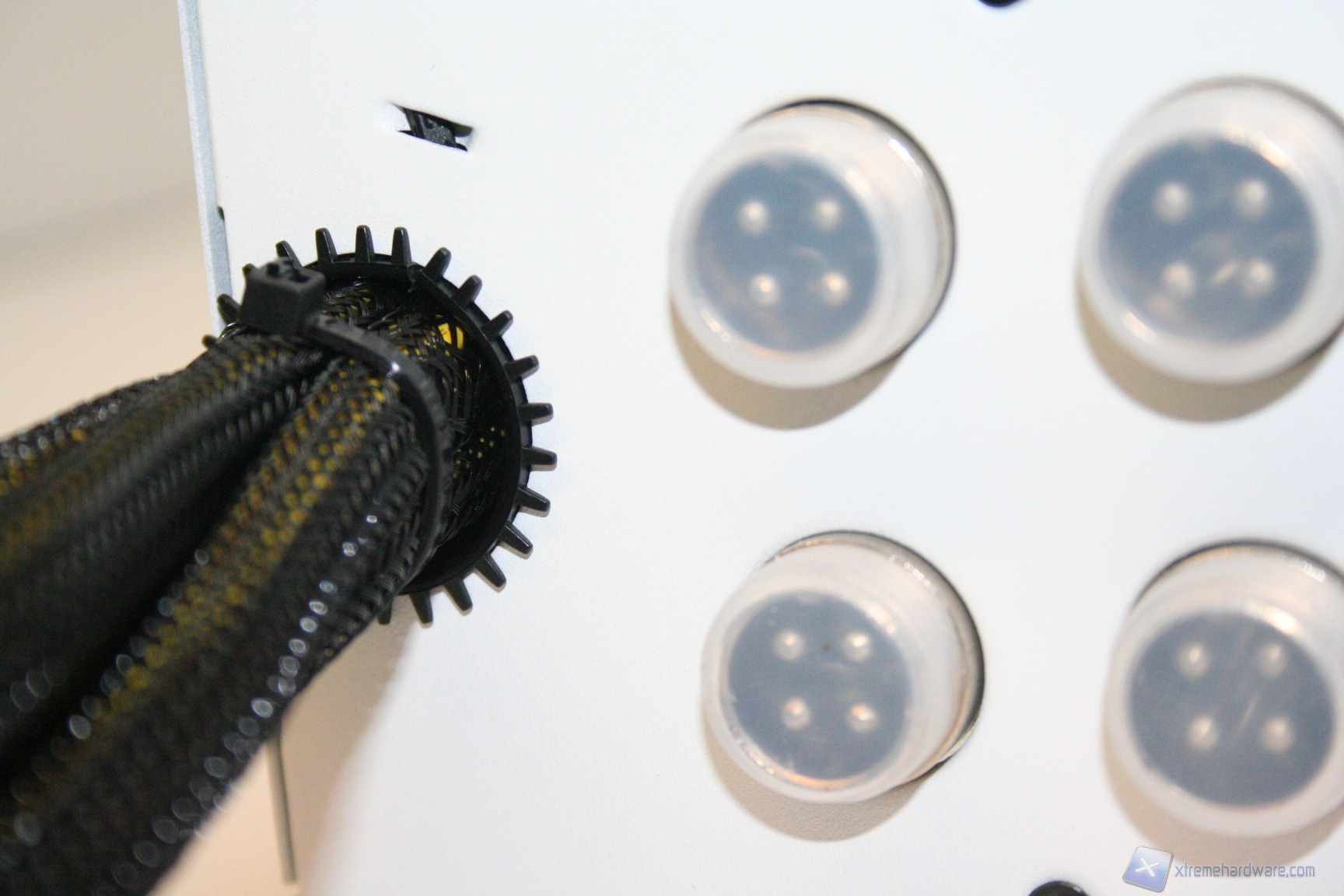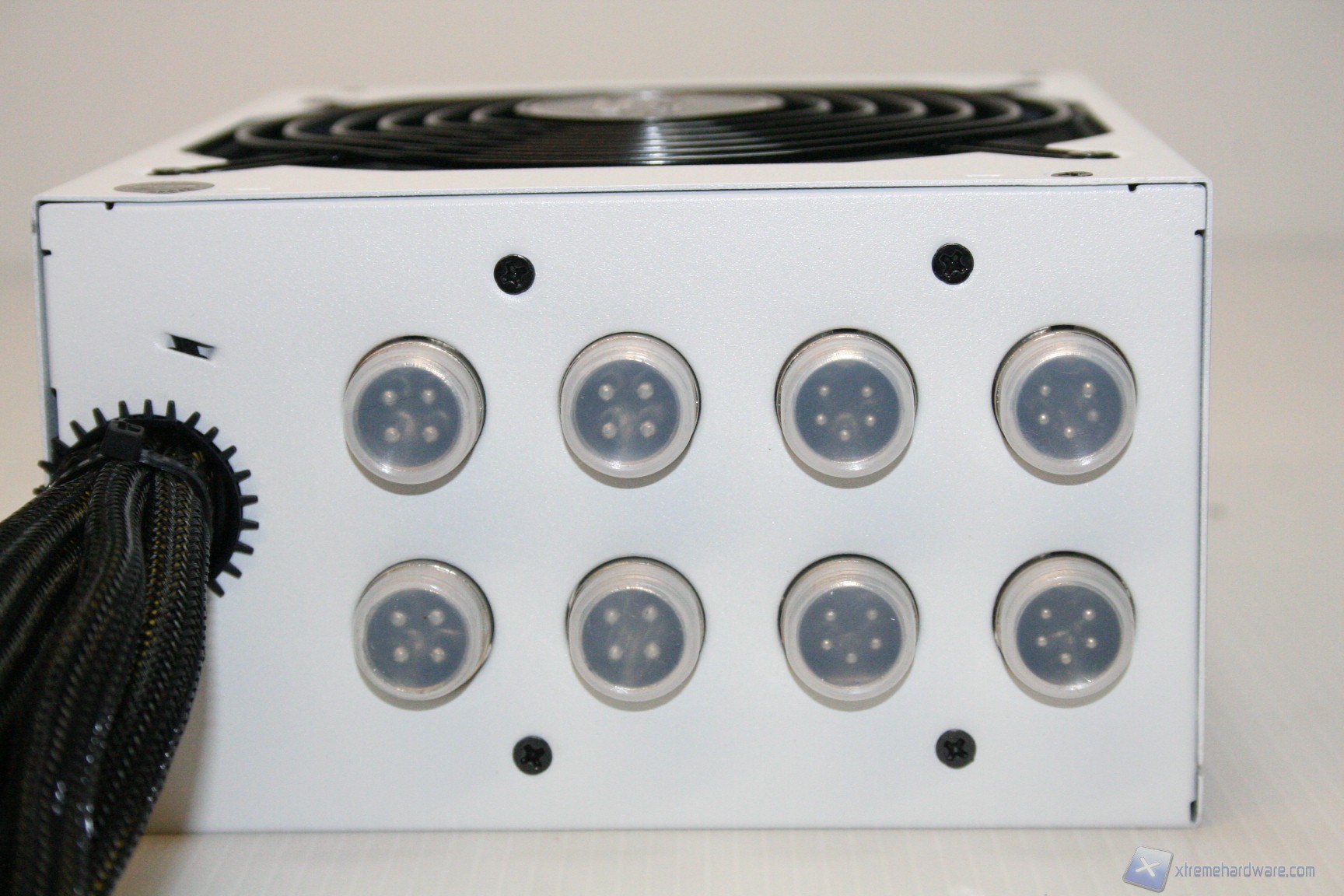 Lateralmente ed in alto a sinistra, guardando posteriormente, c’è uno sticker che avvisa l’utente della perdita della garanzia qualora dovesse essere rimosso, o forato, nell’intento di rimuovere la scocca. Posteriormente sono presenti invece le classiche fessure d’aerazione esagonali con layout a nido d’ape assieme all’ingresso della corrente, dove troviamo un posizionamento classico del pulsante di accensione, che ha dimensioni standard. Vicino a quest’ultimo troviamo il selettore della modalità normale e silenziosa, che però non presenta la minima indicazione riguardo alla variante selezionata, ma bisogna spostare lo switch verso destra per attivare la modalità ‘’normale’’, in quanto parte di fabbrica con quella Silent. Attivando la variante silenziosa, la ventola non viene attivata fino al 50% del carico (600W), a condizione che la temperatura ambiente non sia eccessiva.
