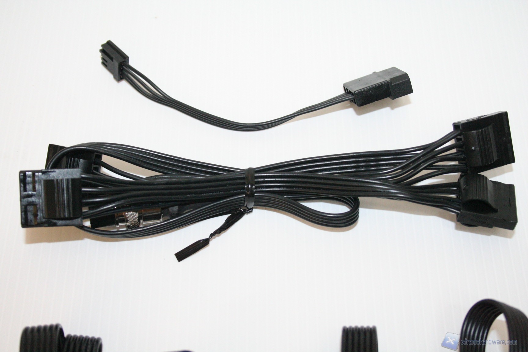Vi mostriamo una fotografia della lunghezza dei cavi. La lunghezza minima è 580mm, più 15cm per ogni altro connettore secondario; questo permetterà di raggiungere facilmente tutte le periferiche del nostro sistema, anche nel caso di cabinet grandi. Data la presenza di due connettori da 6+2 Pin, molex e connettori di alimentazione SATA, sarà possibile alimentare un sistema davvero potente ed equilibrato, anche per via dell’utilizzo fanless entro i 600W di utilizzo. E’ ovviamente presente il supporto a soluzioni Dual e persino Quad GPU, in quanto sono presenti fino a 6 cavi da 6+2 Pin di alimentazione. Con questo alimentatore potrete installare, senza il minimo problema uno SLI di GTX 690 / oppure un CFX di AMD HD 7990, assieme ad una potente CPU overcloccata. L’alimentatore è parzialmente modulare per via del problema precedentemente espresso ovvero che la tipologia dei connettori posteriori ha impedito il conferimento di una completa modularità. E’ ottimo lo sleeving dei cavi come la tipologia dei connettori modulari, notevole la flessibilità e lo spessore contenuto dei cavi.