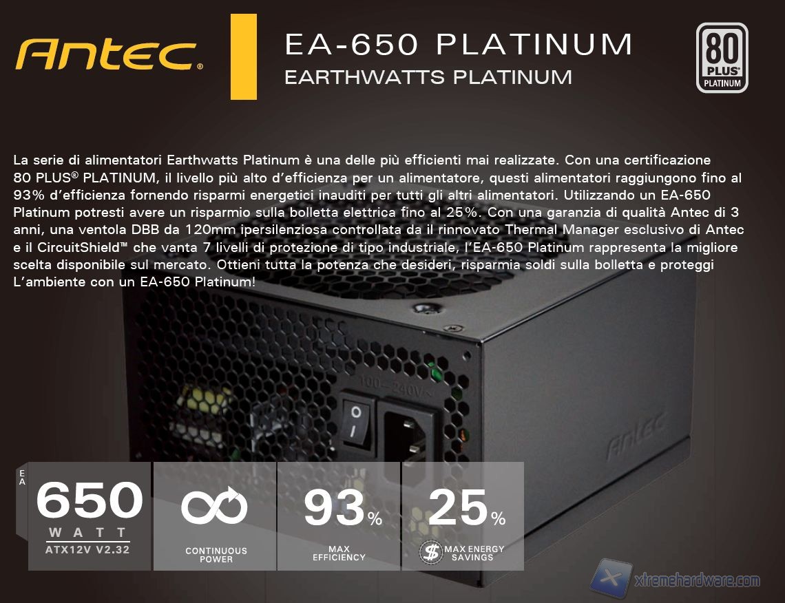 Dopo aver analizzato l’alimentatore Antec HCG-520M ed il modello HCP-850, oggi verrà esaminato il modello EA-650 Platinum, dotato della prestigiosa certificazione 80Plus Platinum. La tipologia purtroppo non è modulare, ma è un eccellente candidato per sistemi potenti ed efficienti, ma soprattutto silenziosi e di qualità.