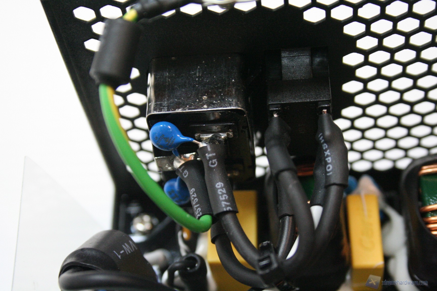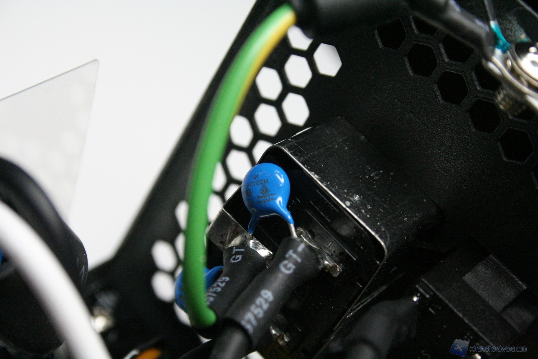 Il primo elemento di un alimentatore moderno è il sistema di filtraggio delle emissioni elettromagnetiche e radio, precisamente l’EMI/RFI Transient Filter. Viene posizionato necessariamente dietro all’ingresso della corrente AC e  sono stati incluse le necessarie componenti affinché non ci siano interferenze elettromagnetiche, tra cui due condensatori ad Y nel ricettacolo frontale e nel PCB principale altri due, assieme a due condensatori ad X e due induttori toroidali,  ead un varistore (MOV, Metal Oxide Varistor) ovvero sostanzialmente una resistenza, voltaggio-dipendente, che protegge l’alimentatore ed il sistema da picchi di voltaggio provenienti dalla rete elettrica esterna. Vi ricordiamo che se un alimentatore non è dotato di un MOV nell’EMI/RFI Transient Filter si dovrebbe sempre utilizzare il proprio sistema con un gruppo di continuità (o UPS), che agirà da filtro a protezione dei picchi di voltaggio; questi ultimi potrebbero danneggiare seriamente non solo l’alimentatore stesso ma anche l’intero sistema! Di solito questa componente viene rimossa per ragioni di costo di produzione, e progettazione.