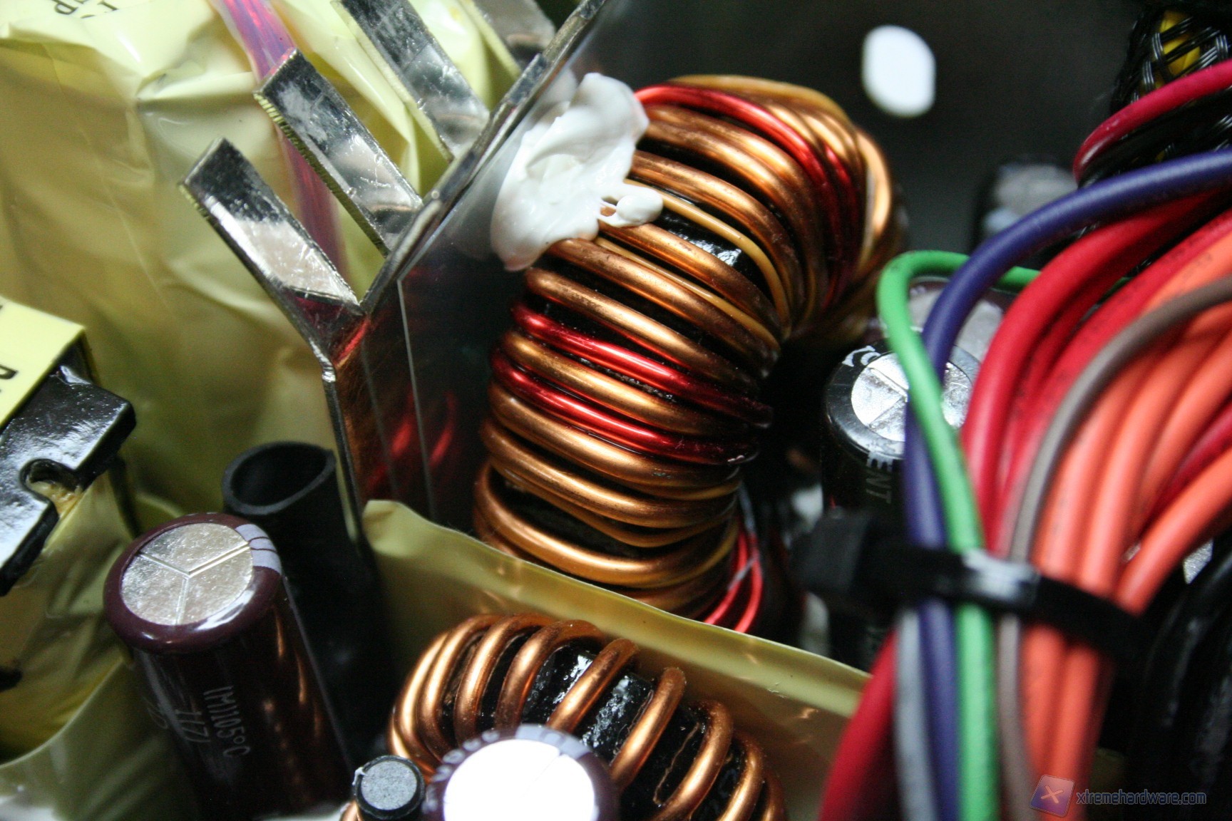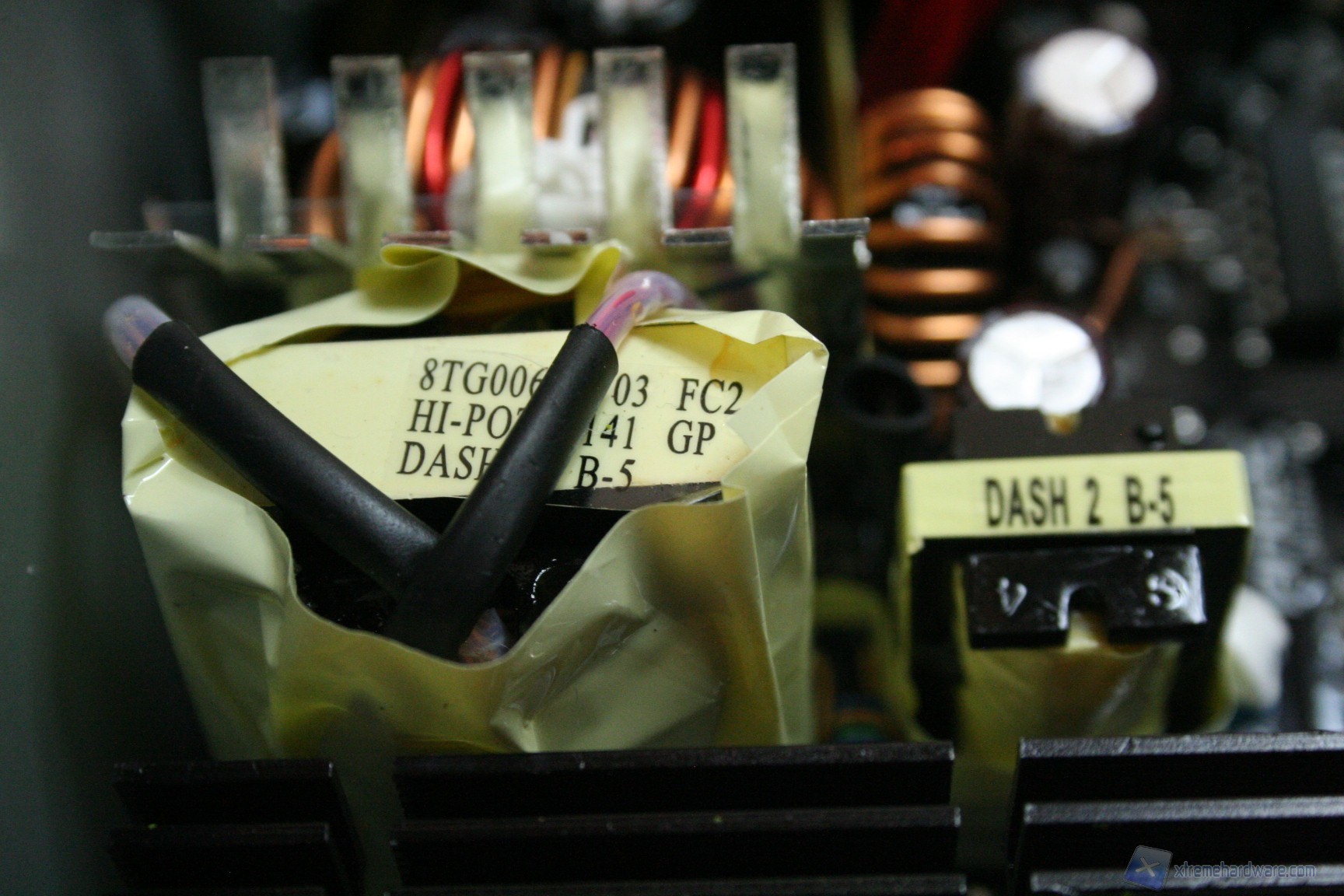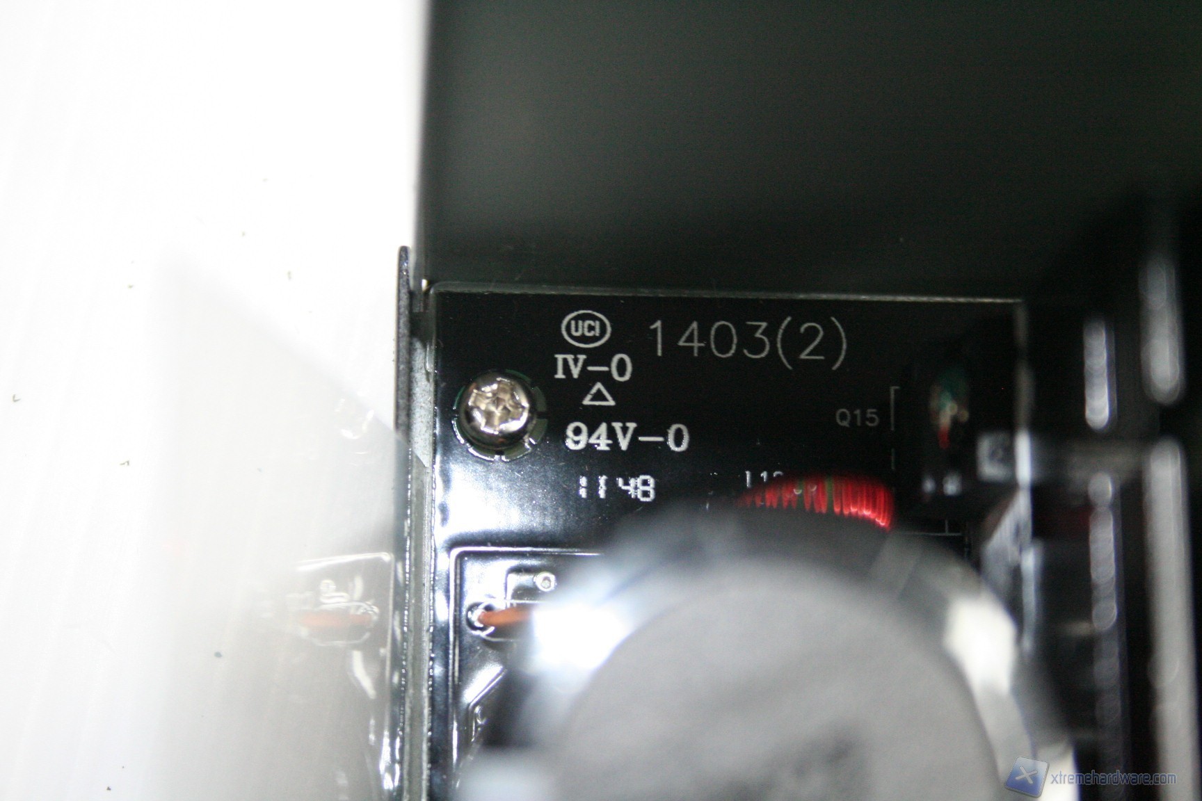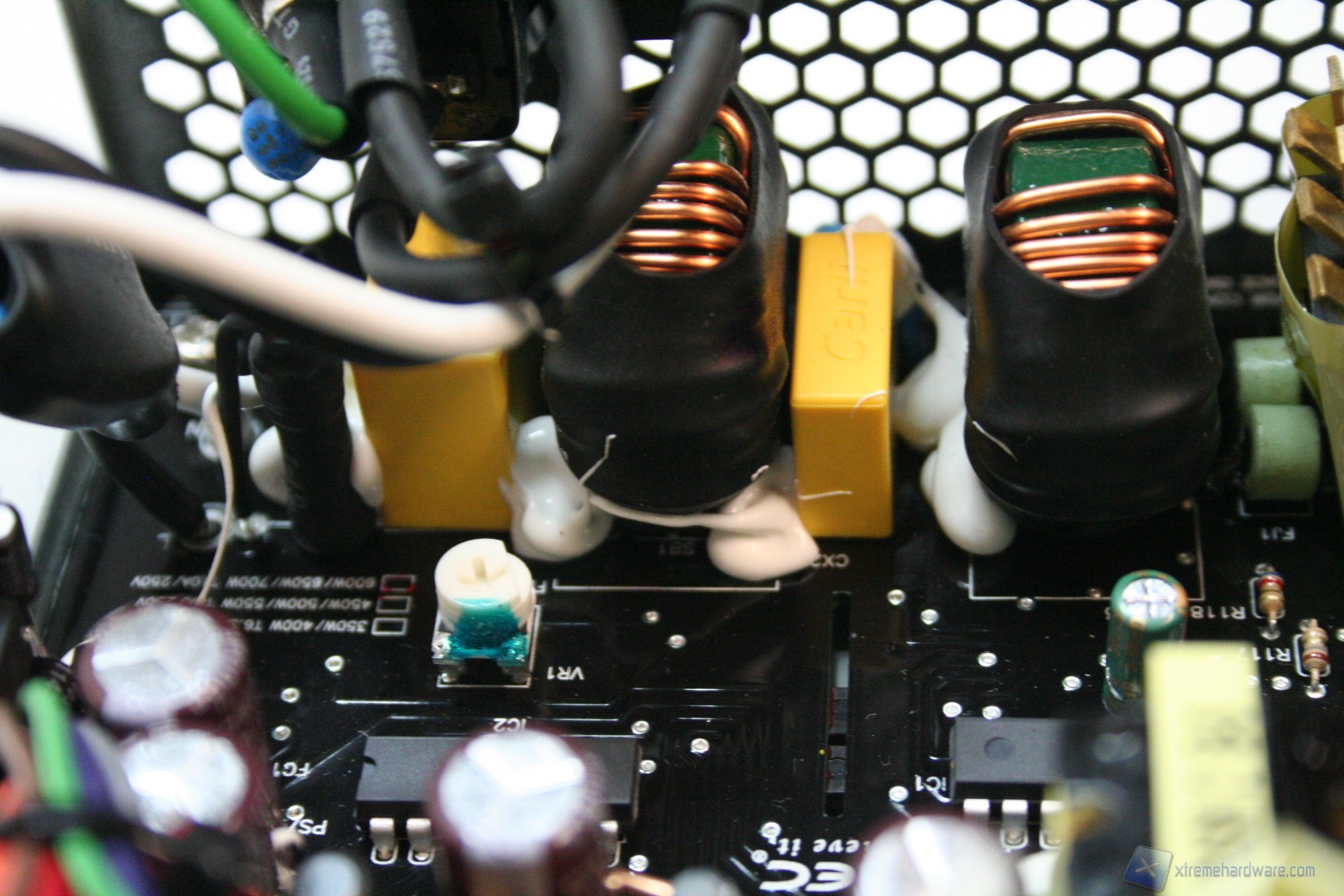 Anche in questo caso sono stati utilizzati dissipatori passivi con dimensioni contenute, similmente al modello HCP-850, per i Voltage Regulation Modules. E’ anche presente un termistore subito dopo il filtraggio dei transitori; molte componenti sono state incollate, e ciò ormai è diventato uno standard di montaggio perché questo metodo è necessario per la tipologia di produzione utilizzata, che consiste prima nel posizionamento delle componenti sul PCB inferiore, poi nella loro adesione al PCB stesso tramite l’adesivo termico ed infine l’inserimento dell’intera struttura nella macchina di saldatura a onda (senza Piombo presumibilmente). Così facendo si ottiene una qualità di assemblaggio, e conseguentemente di saldatura, migliore. La topologia utilizzata, come abbiamo detto è la ACRF e si basa sulla generazione dei +12V grazie a MOSFETs dedicati, a cui ne seguono altri che generano le altre rail per conversione DC-DC.