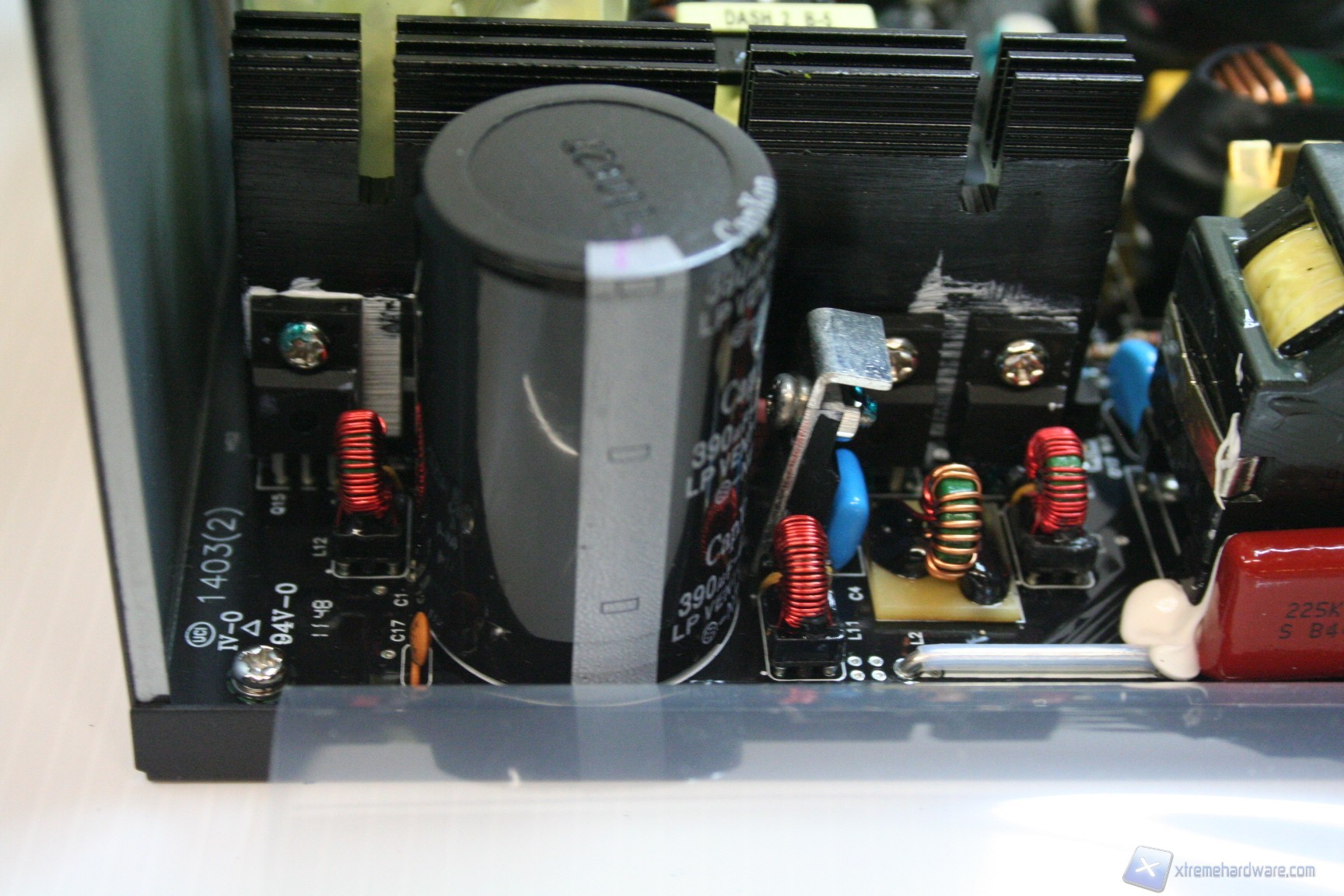 Nel primario è presente un solo condensatore elettrolitico CapXon, non giapponese quindi, avente le seguenti caratteristiche: 420V, 390μF, 85°C. I condensatori del circuito primario agiscono come buffer e sono molto importanti perché la loro presenza aiuta a proteggere il nostro alimentatore ed il computer stesso da pericolosi sbalzi di tensione, e generalmente vengono collegati in parallelo al fine di sommare le singole capacità, o alternativamente – per modelli meno potenti come in questo caso – vengono utilizzati singoli condensatori aventi anche 390μF.
