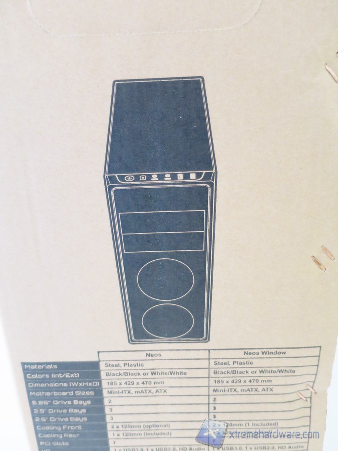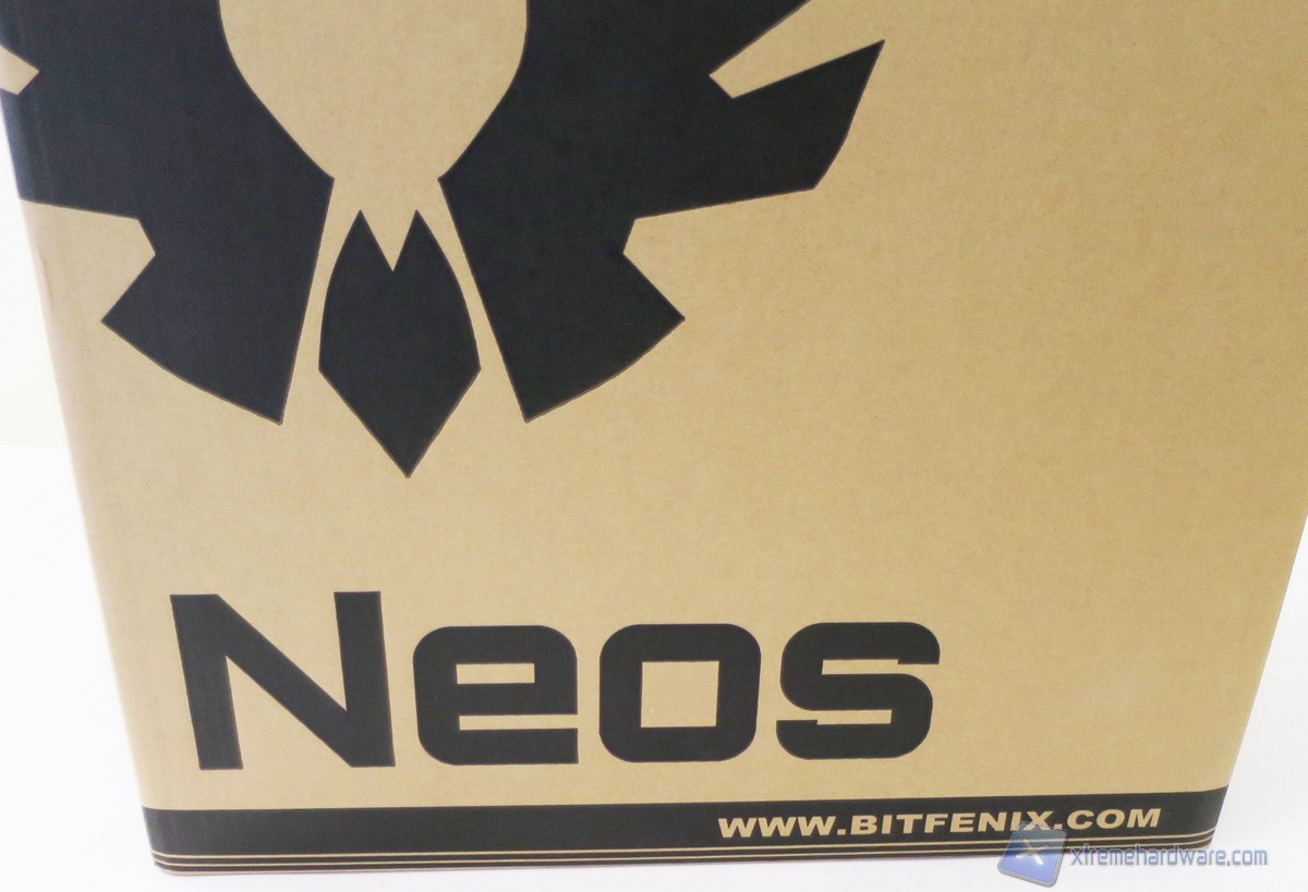 La confezione del BitFenix Neos è come sempre realizzata in cartone. Nella parte frontale ed in quella posteriore vengono riportate alcune informazioni come il modello del case, un’immagine illustrativa dello stesso, alcune caratteristiche salienti del prodotto ed i riferimenti all’azienda.