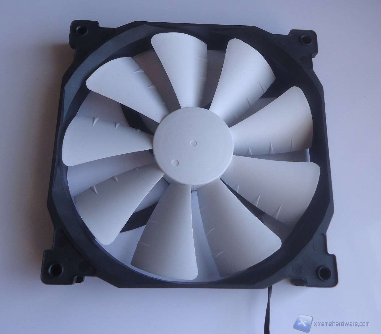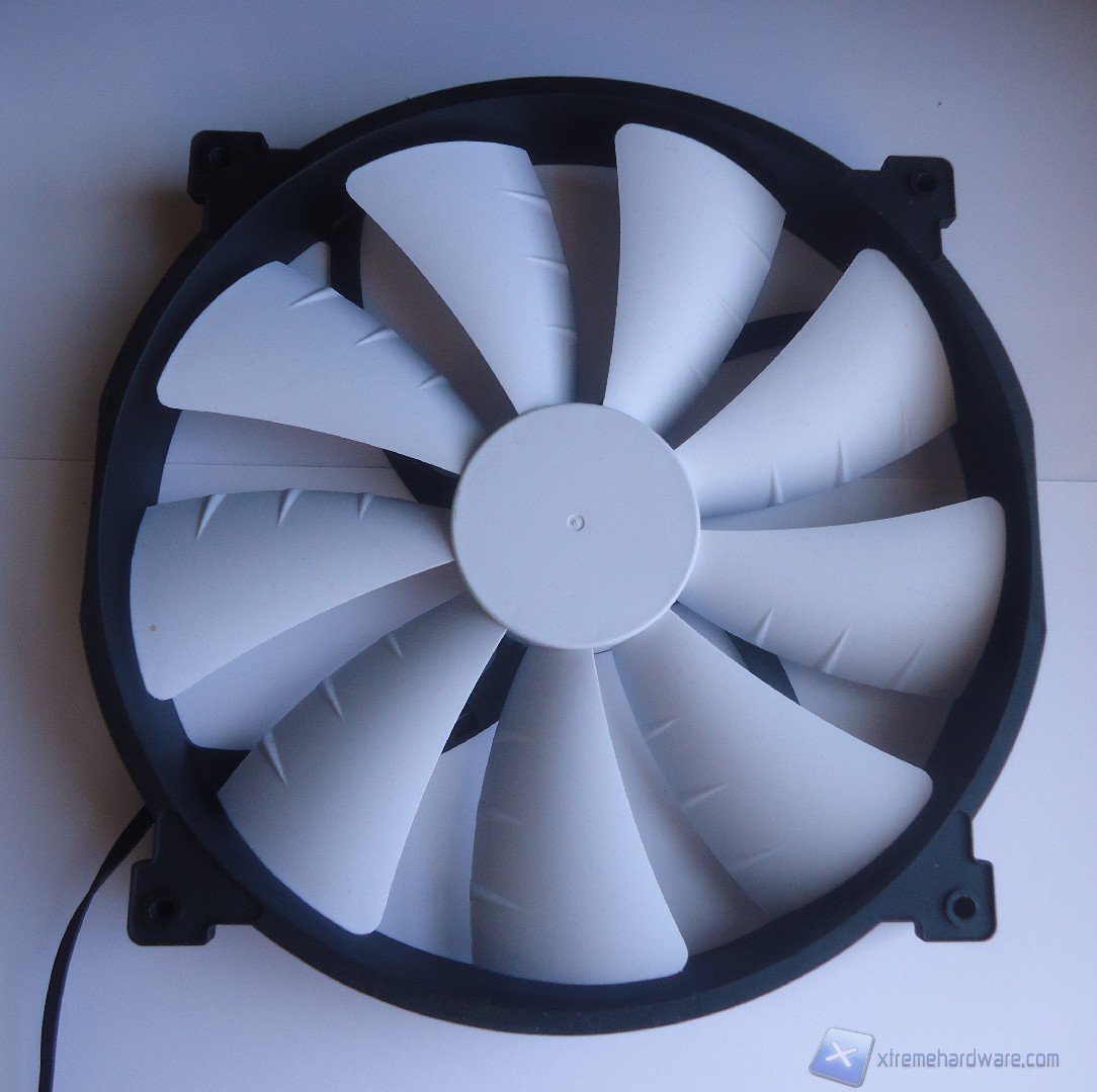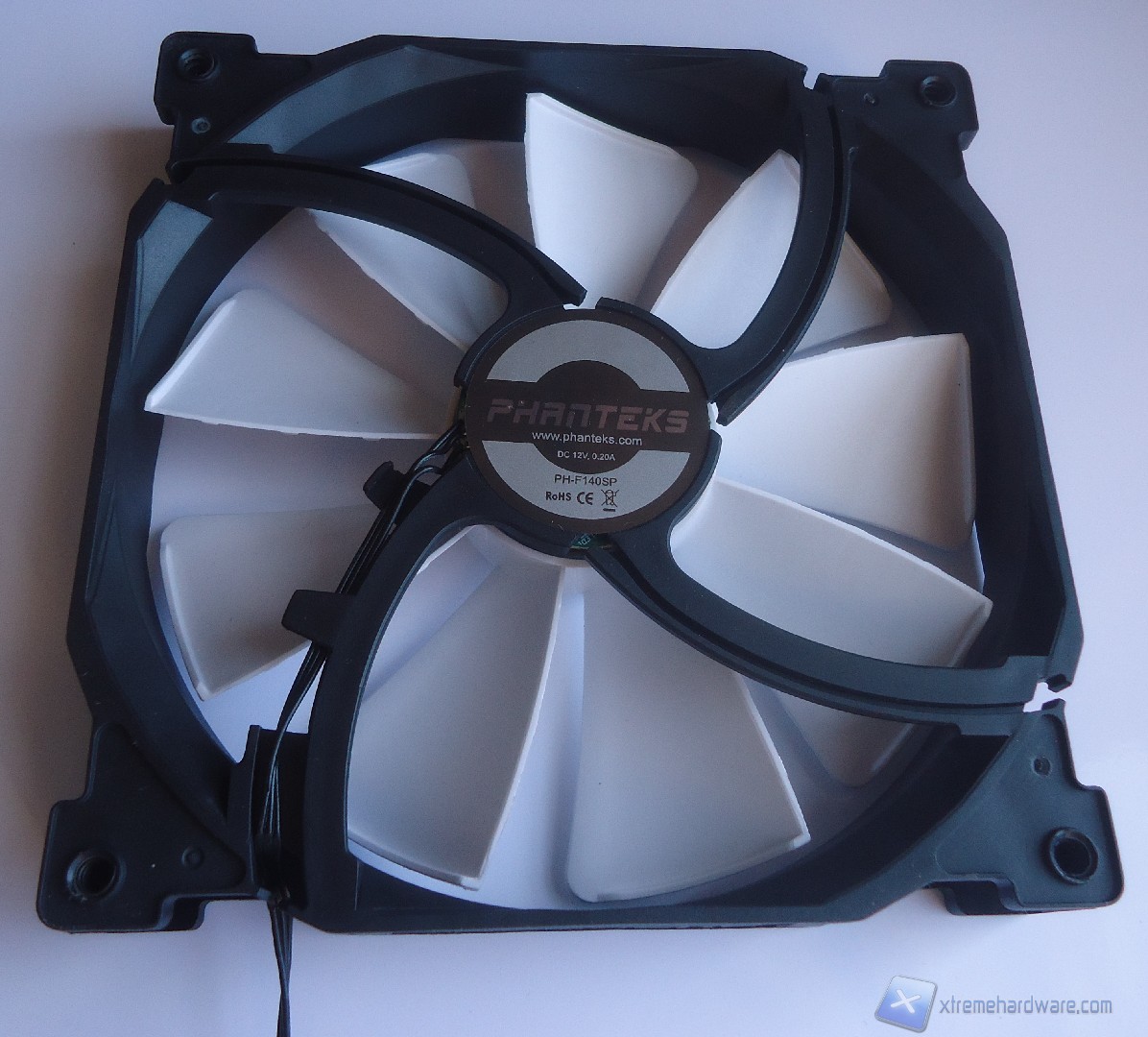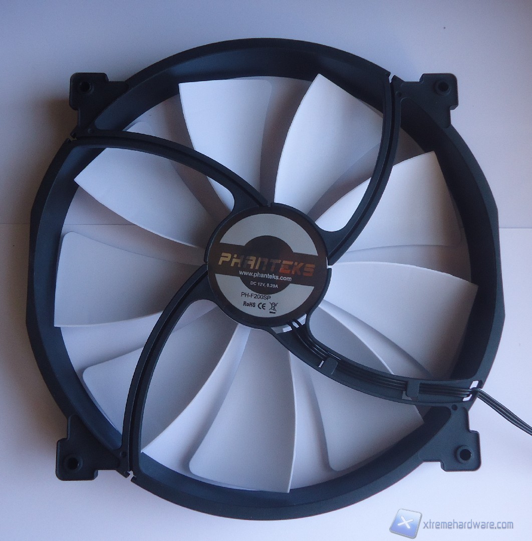 La ventola frontale è la PH-F200SP, volta a fornire buona pressione statica (fino a 1.04 mm H2O) con il suo design a 9 pale ed è dotata di un frame con angoli gommati per ridurre le vibrazioni. L’assorbimento a 12V è di 0,25 A (consumo 3watt) e la ventola ha un regime di rotazione che varia da 250 a 800 RPM.