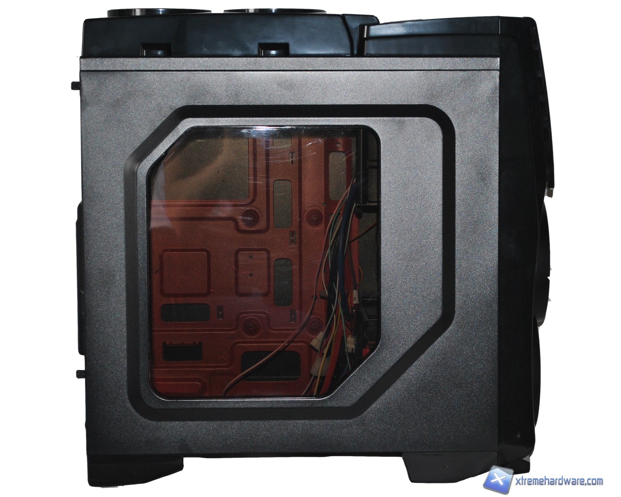 L'impatto estetico di questo case è davvero notevole, il look risulta decisamente aggressivo e lo sguardo si posa subito sul frontale caratterizzato dalla presenza di un paio di turbine, chiaro richiamo al mondo dell'aviazione. Dietro le turbine ci sono ovviamente le ventole con LED rosso. La colorazione del cabinet è un nero lucido per quanto riguarda frontale e top in plastica. Le altre superfici invece hanno un tocco più opaco essendo in metallo. Il fatto che la verniciatura delle componenti in plastica sia lucida ovviamente fa sì che queste tendano a trattenere ed evidenziare eventuali ditate. Il tema avionico è ripreso sul top dove trovano spazio altre due turbine che nascondono un alloggiamento per altre ventole da 120mm. Segnaliamo che la griglia del top atta all'alloggiamento delle ventole è removibile.