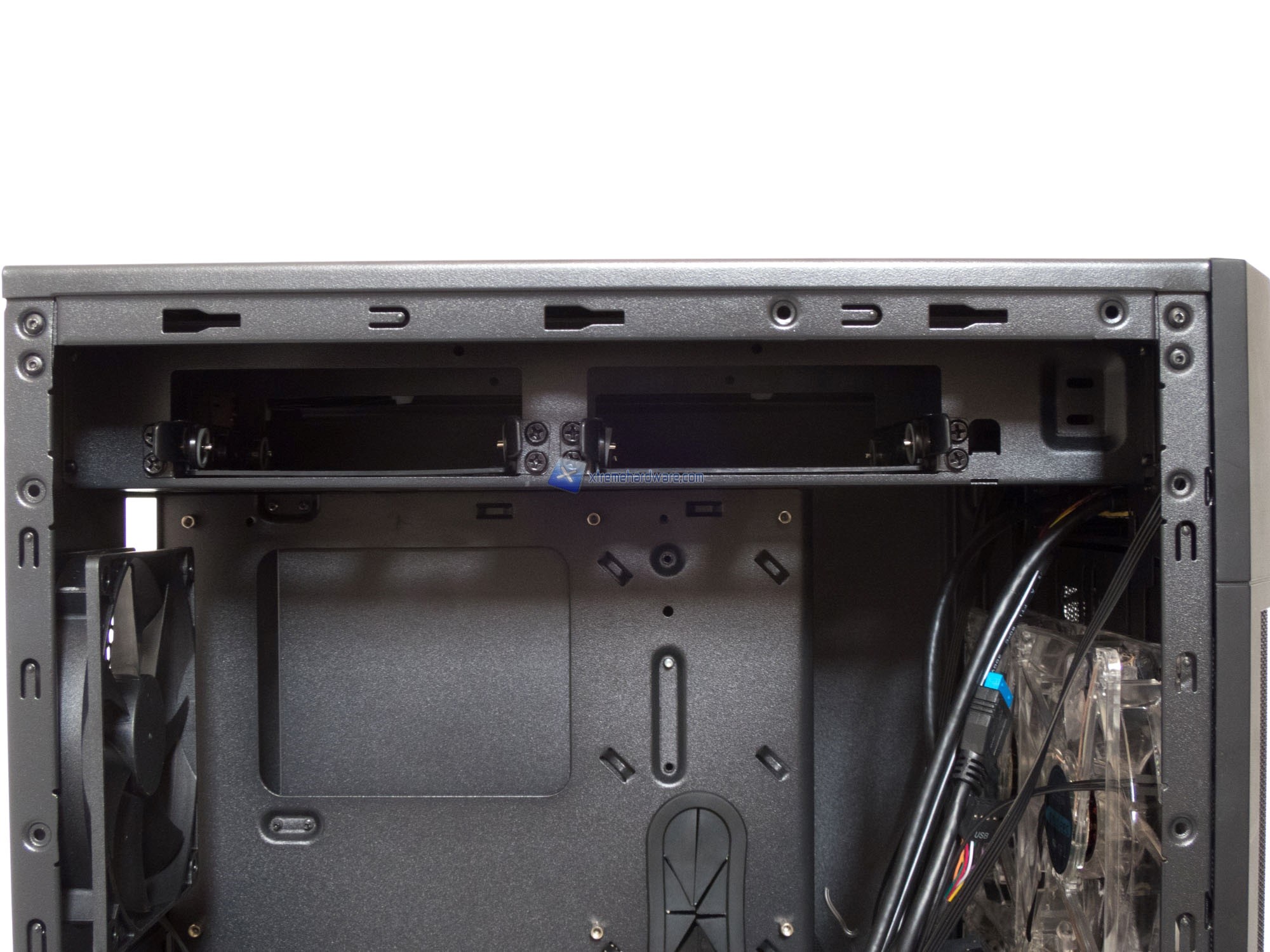 Nella parte superiore troveremo il Tray unico che servirà a poter installare nelle slitte due Hard Disk da 3,5’’ e un’unità da 5,25’’ nel frontale. Come dicevamo anche rimuovendo tale Tray potremo beneficiare di uno spazio al millimetro per installare un dissipatore AIO nel Top del case.