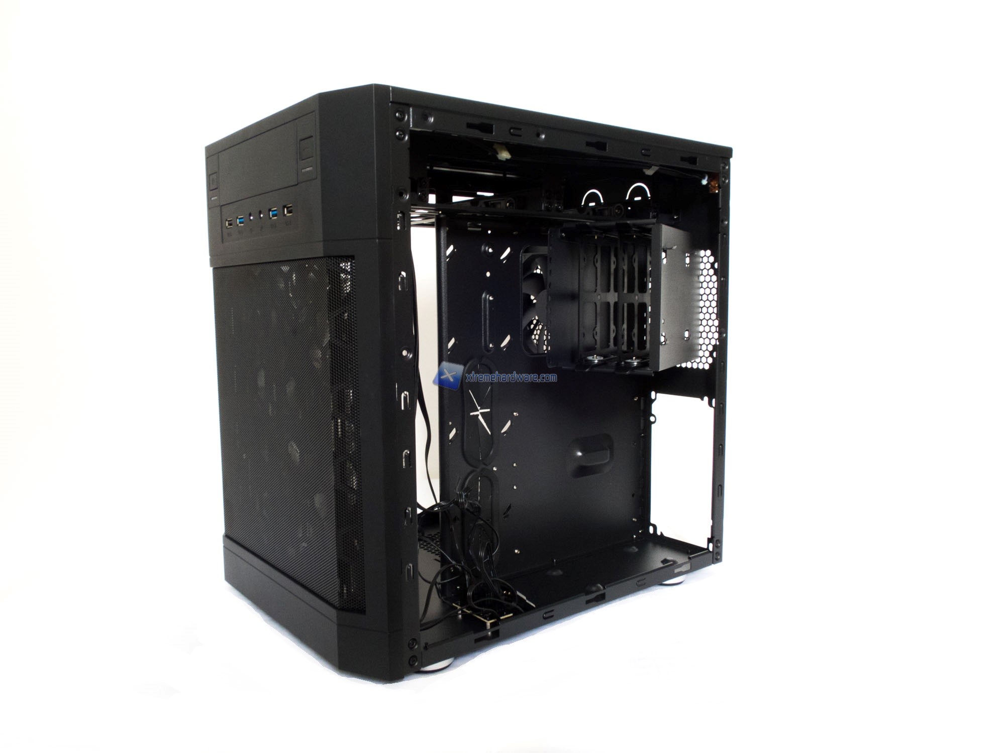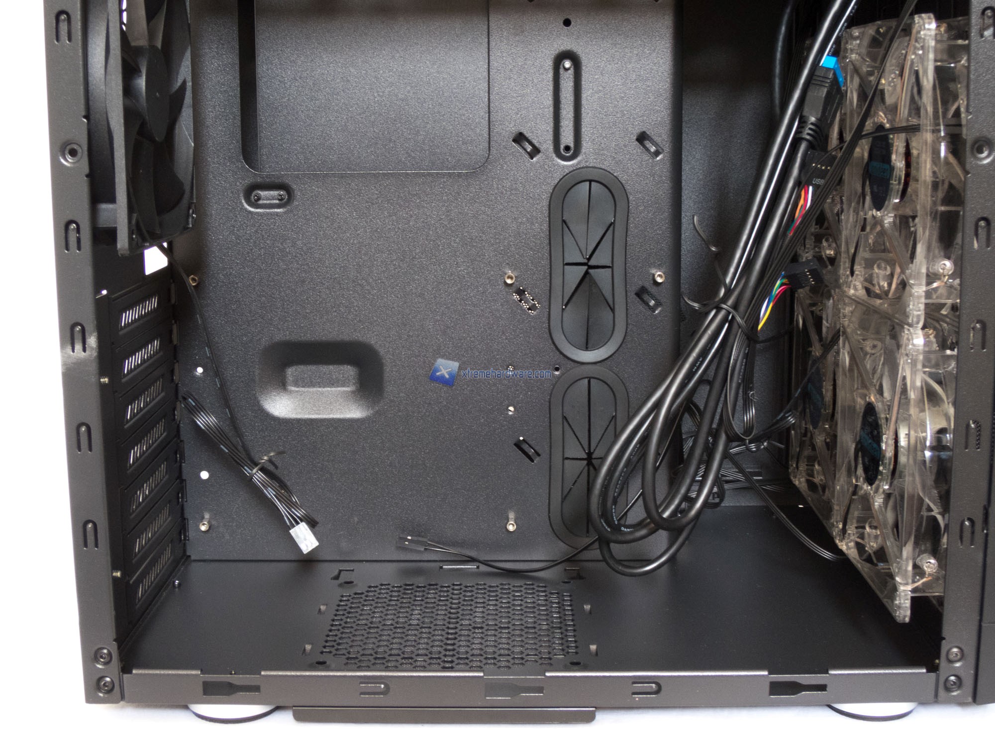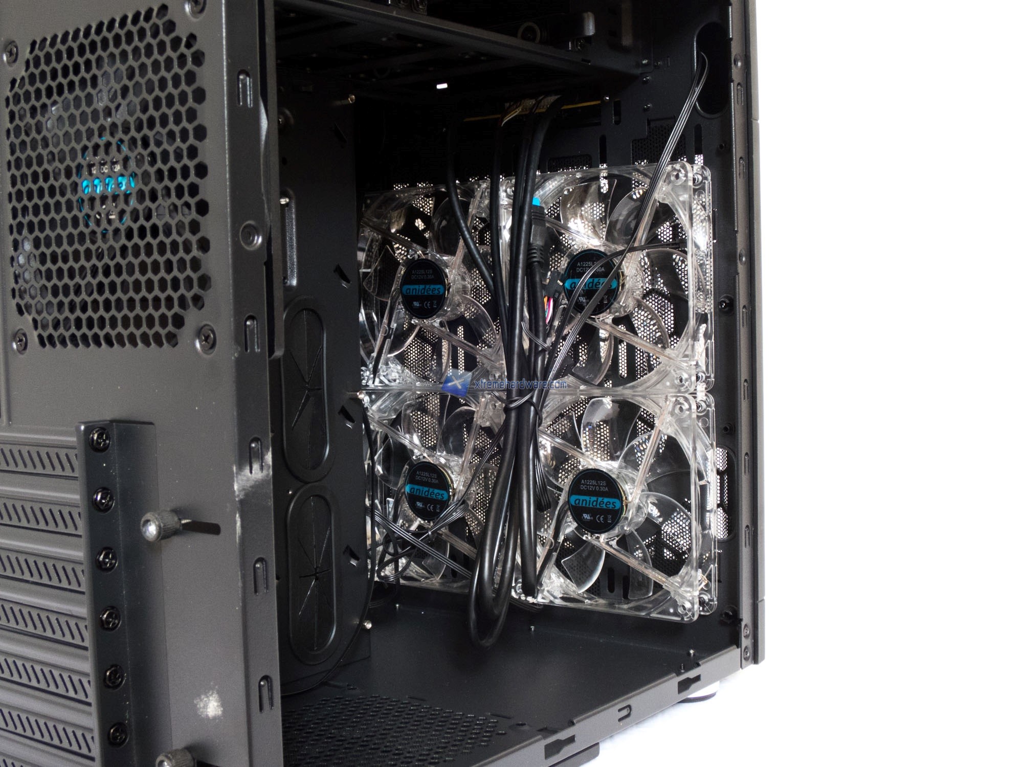 Passando al frontale nella parte interna osserviamo le ben 4 ventole da 120mm a LED Blu che forniranno un buon flusso d’aria.