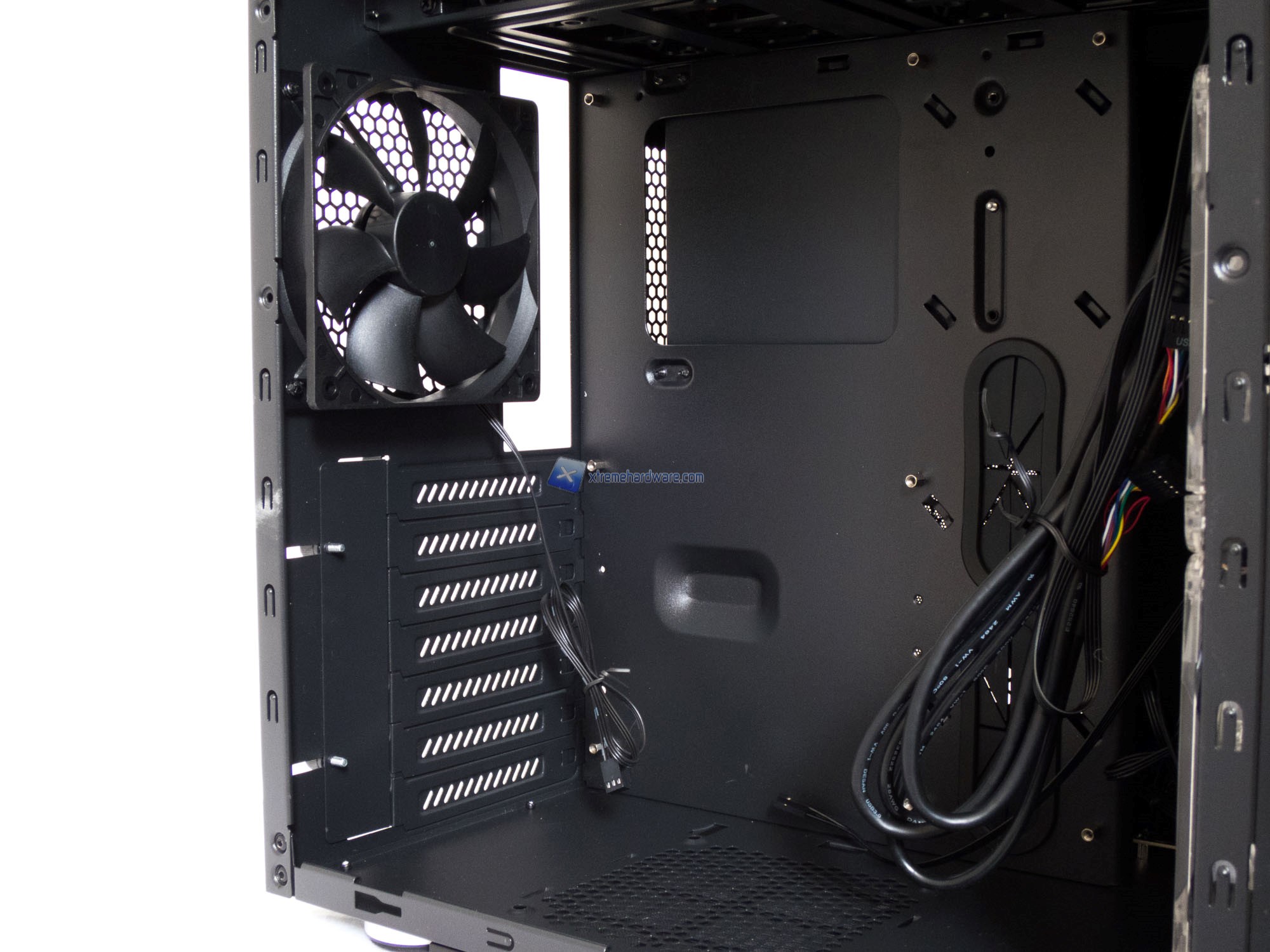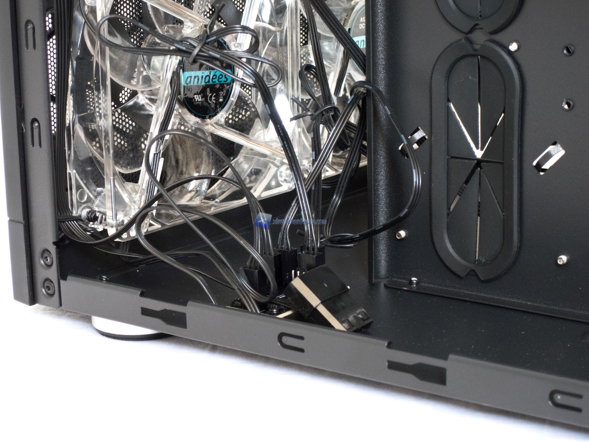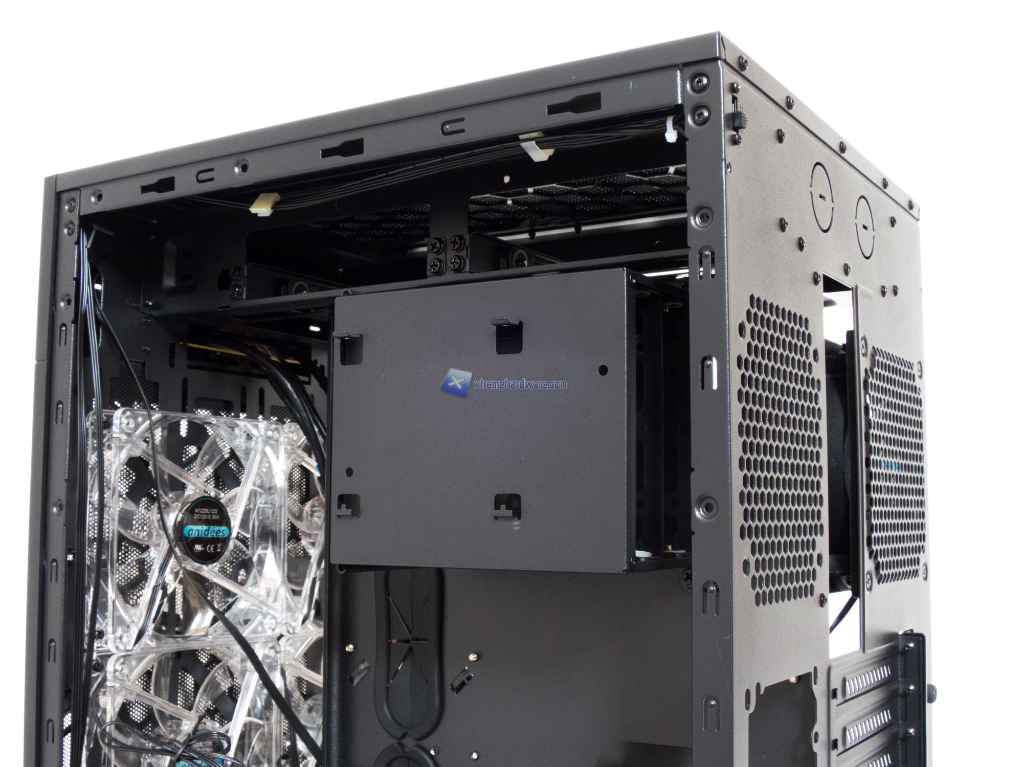 Partendo dal lato principale possiamo osservare un classico Tray in SECC corredato da fori con passacavi in gomma. Vi annunciamo già da ora che tali fori saranno utili solo nel caso in cui utilizzaste schede madri in formato ATX ridotto comunemente chiamate Flex ATX. Stranamente Anidees ha creato un Tray che non permetterà un cablaggio ‘’ordinato’’ utilizzando schede madri in formato classico ATX o Micro-ATX come vedrete nel capitolo relativo al montaggio.