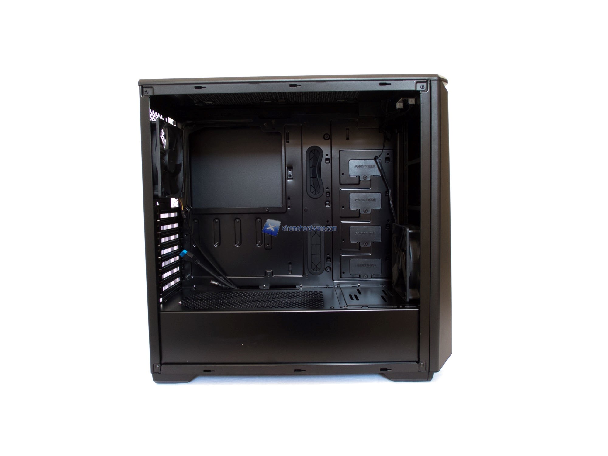 Una volta rimosse le paratie laterali possiamo accedere all’interno del case. Lo spazio offerto dal P400 è in parte molto simile a quanto visto già con l’Enthoo Pro M. Precisamente ci riferiamo al fatto che Phanteks ha deciso di rimuovere del tutto i cage principali delle periferiche 5,25” e degli Hard Disk offrendo un design modulare e personalizzabile. Nelle ultime serie e case Phanteks troveremo solo dei piccoli plate con la scritta Phanteks che insieme a supporti/slitte in plastica acquistabili a parte ci permetteranno di montare Hard Disk in formato 3,5’’ nella loro classica posizione. In caso contrario avremo più spazio per i componenti HW principali. Ovviamente è scomparsa la possibilità di inserire unità ottiche da 5,25”.