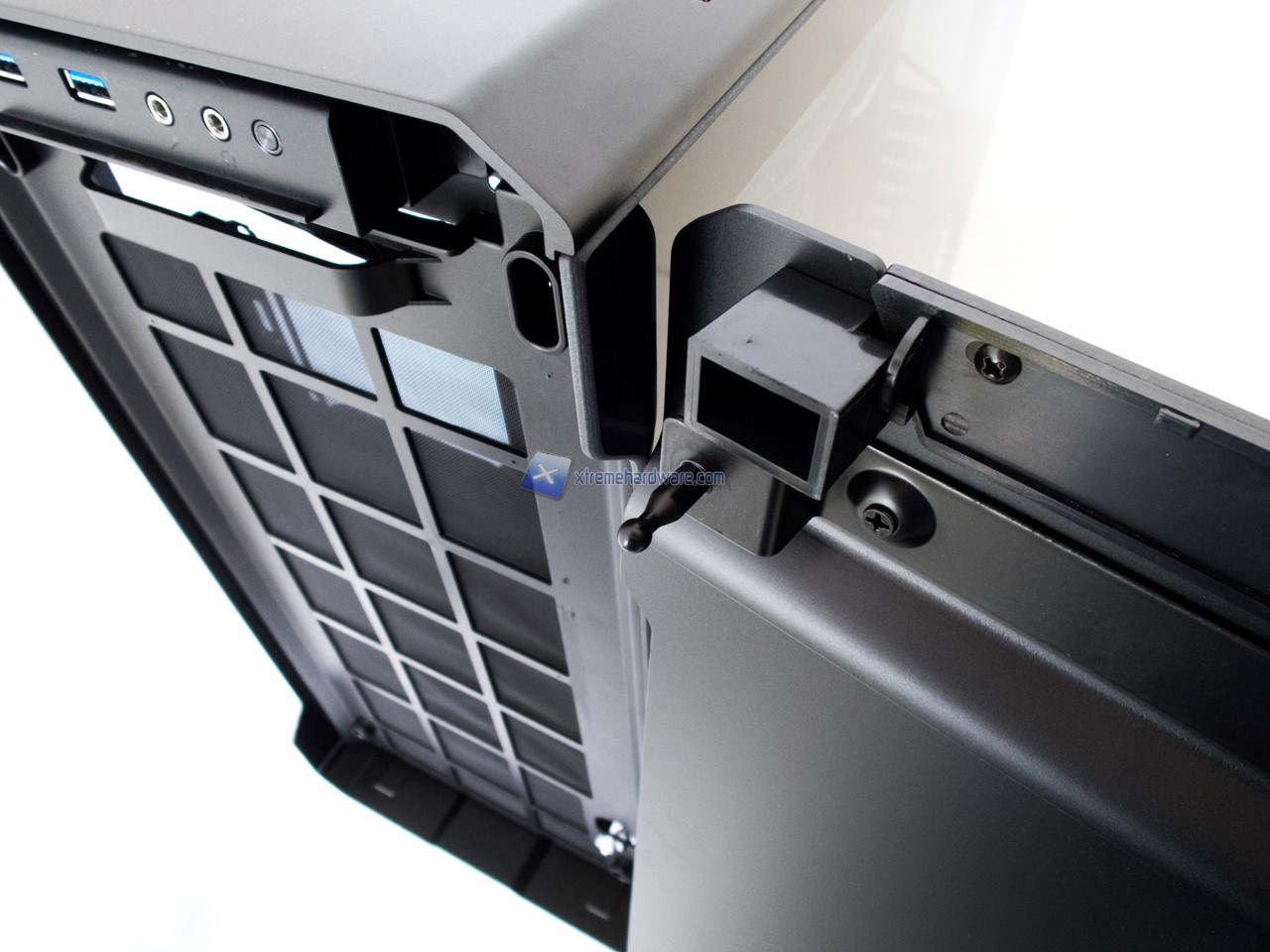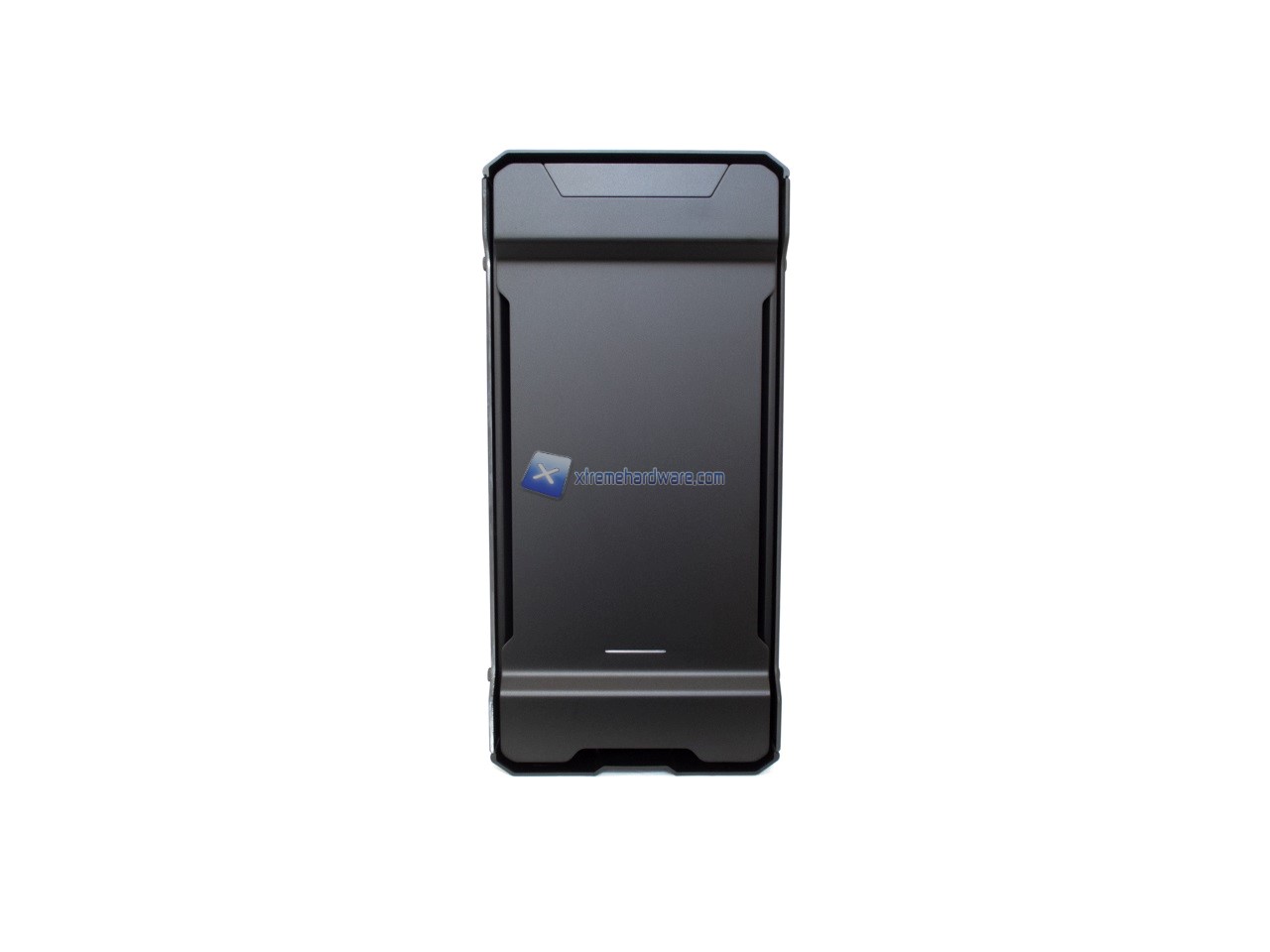 Partendo come sempre dal frontale osserviamo una paratia removibile in alluminio sagomata e dalle linee pulite. Non troviamo alcun bay per unità ottiche come oramai è prassi nei recenti case. Quello che balza all’occhio è sicuramente la striscia orizzontale nella parte inferiore da cui verrà irradiata l’illuminazione di un LED posto dietro tale pannello. LED di tipo RGB che come visto in altri modelli ci permetterà con un semplice click di variare colore nonché di modificare effetto di retroilluminazione. Insomma piccole accortezze per rendere il case completo sotto diversi aspetti.